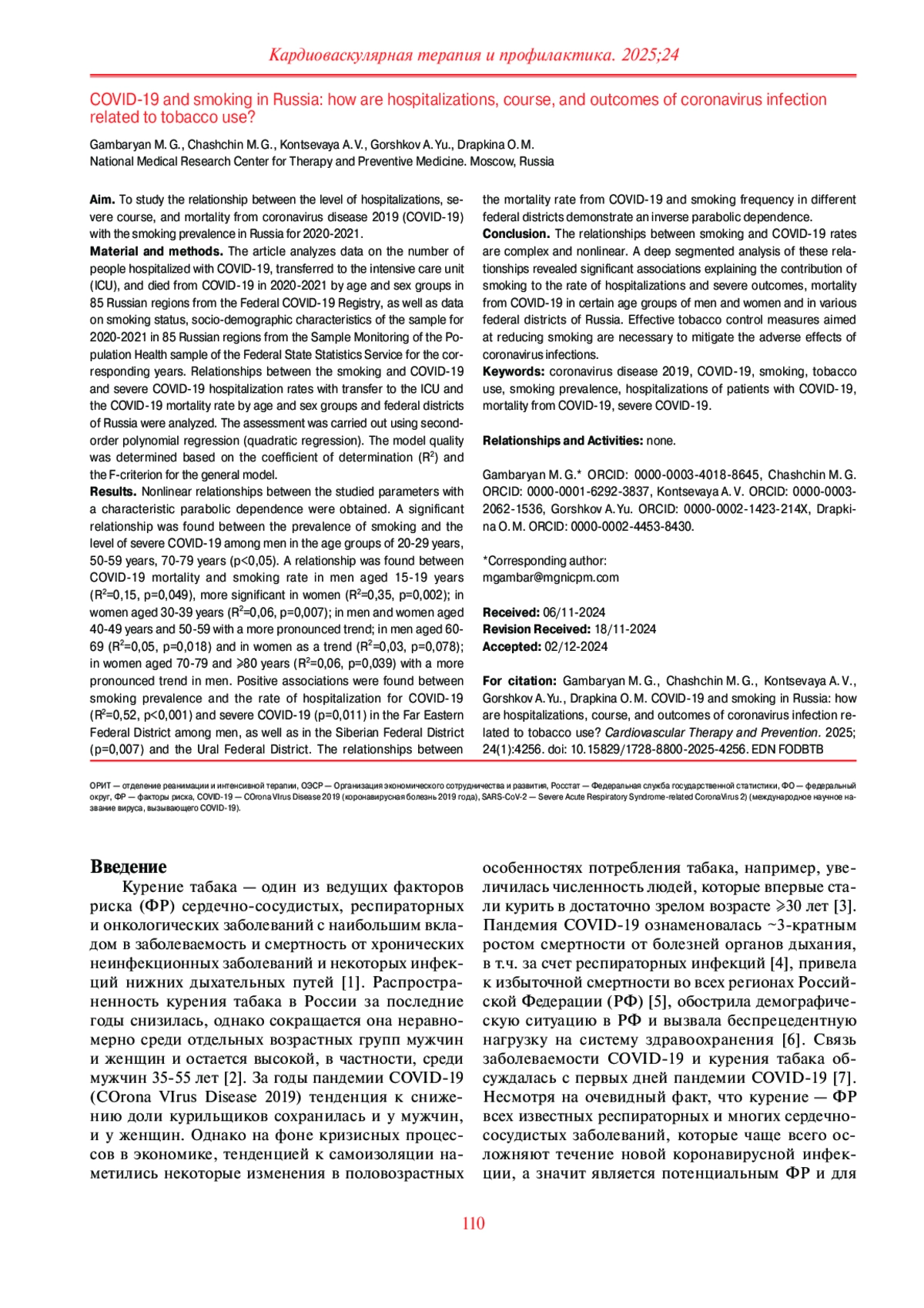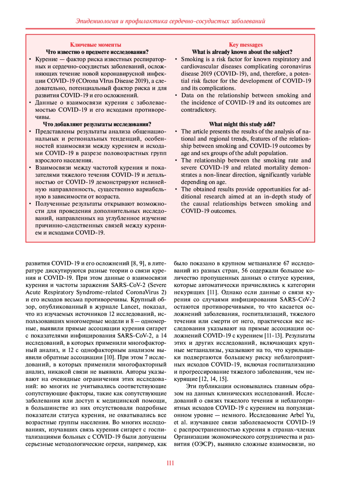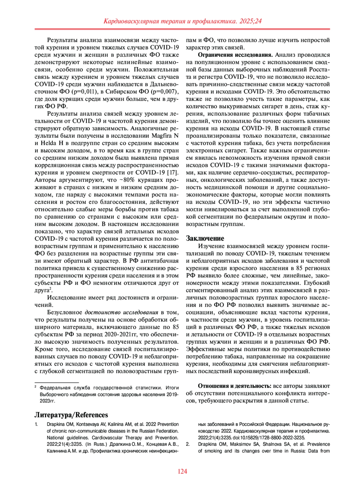 Заключение. Взаимосвязи между частотой курения и показателями COVID-19 сложны и нелинейны. Глубокий сегментированный анализ этих взаимосвязей позволил выявить значимые ассоциации, объясняющие вклад курения в уровень госпитализаций и тяжелых исходов, летальности от COVID-19 в отдельных возрастных группах мужчин и женщин и в различных ФО РФ. Эффективные меры антитабачной политики, направленные на сокращение курения необходимы для смягчения неблагоприятных последствий коронавирусных инфекций.