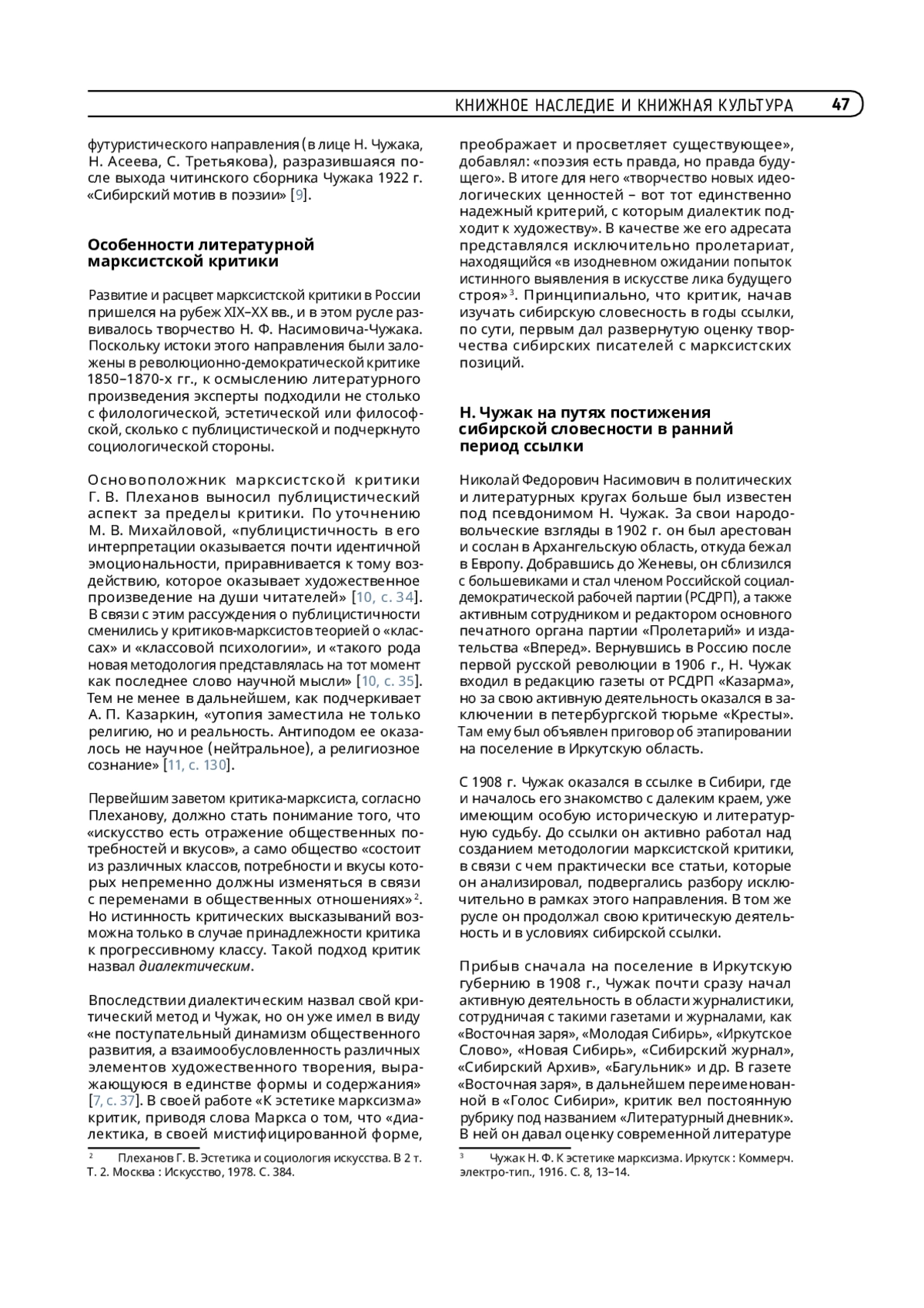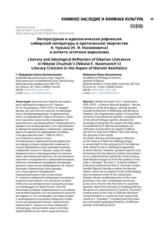 Критическое творчество известного публициста-марксиста Н. Чужака (Н. Ф. Насимовича; 1876–1937), на первый взгляд, уже достаточно изучено в книговедении и литературоведении. Но фрагментарность исследований и недостаточность глубокого научного осмысления специфики его критического наследия диктует необходимость привести в систему данные о его публикациях в сибирской периодике и сборниках, приходящихся на время его пребывания в Сибири и на Дальнем Востоке с 1908 по 1922 г., что и является целью статьи.