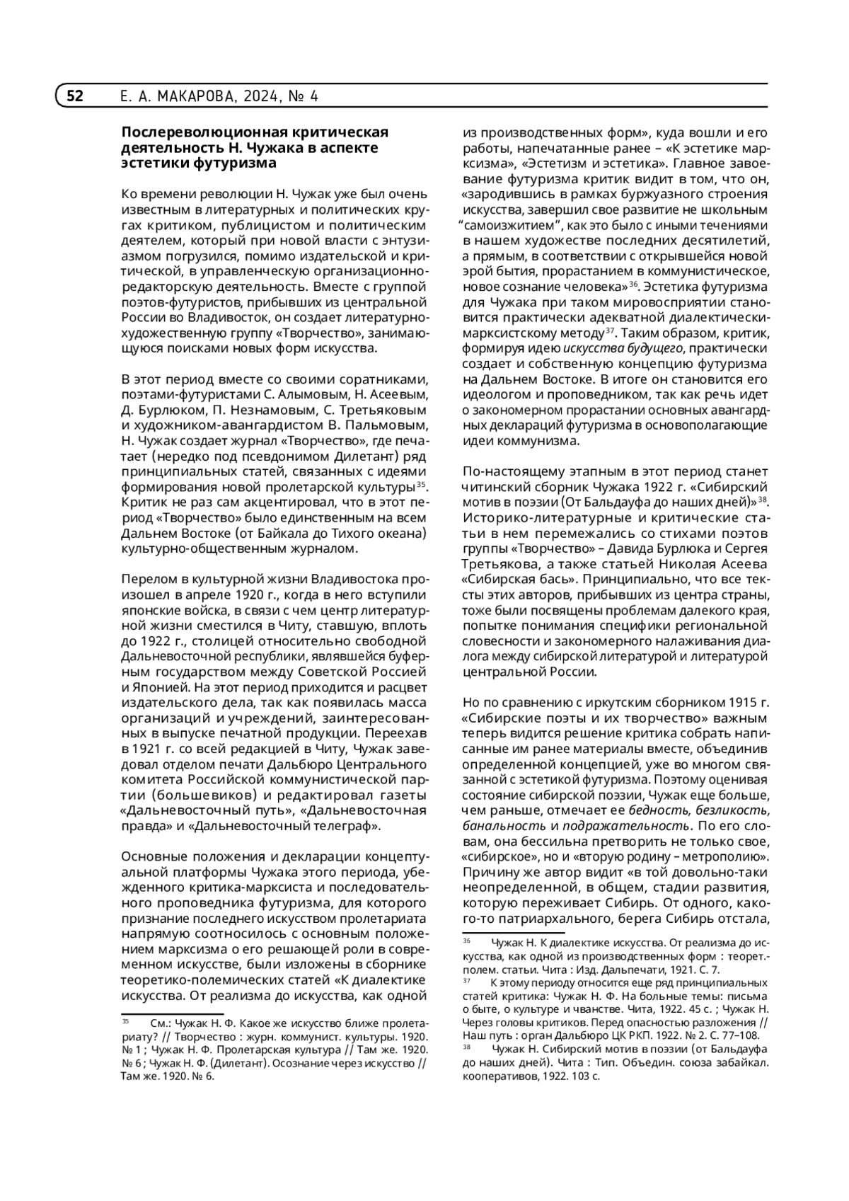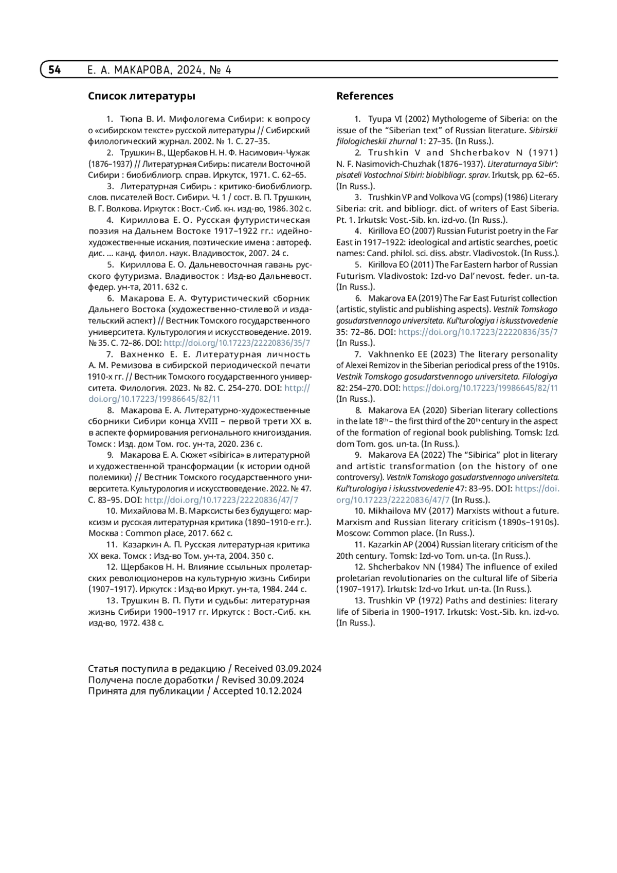 6. Макарова Е. А. Футуристический сборник Дальнего Востока (художественно-стилевой и издательский аспект) // Вестник Томского государственного университета. Культурология и искусствоведение. 2019. № 35. С. 72-86. https://doi.org/10.17223/22220836/35/7.