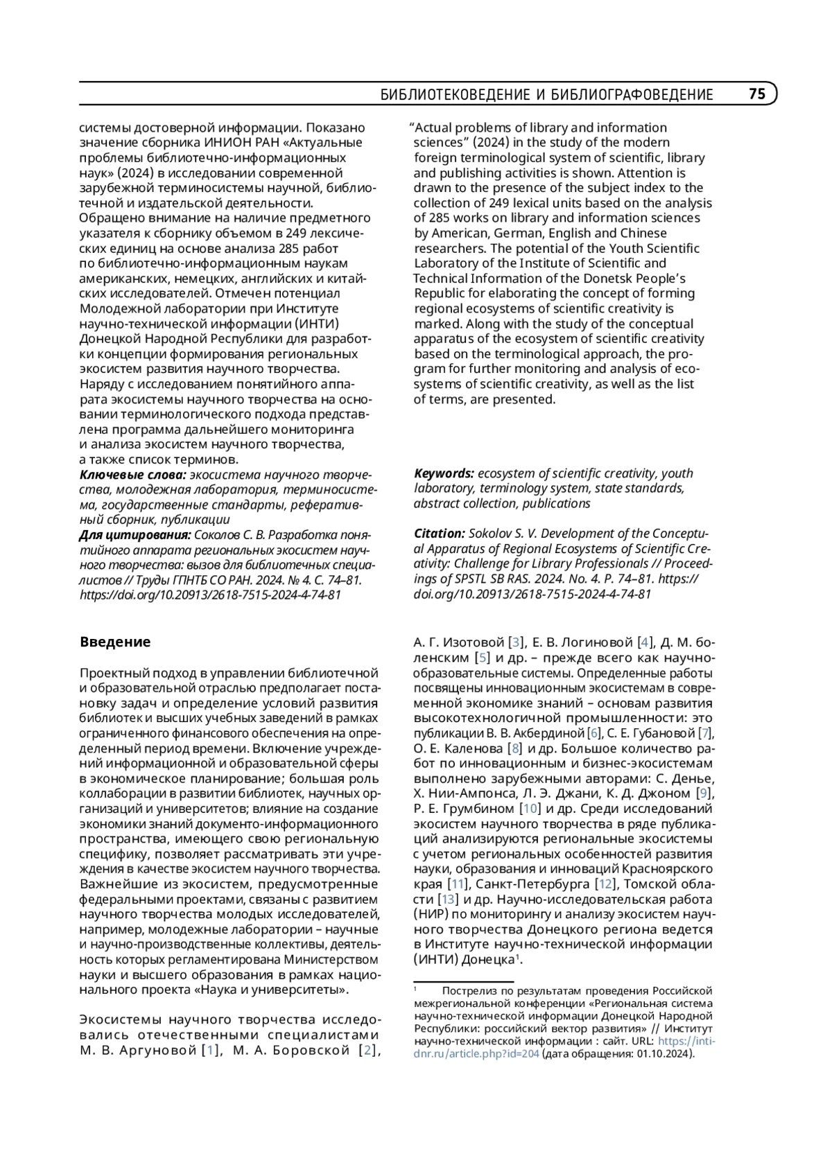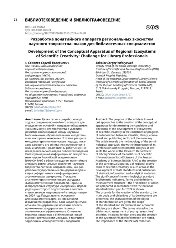 Цель статьи – разработка подходов к созданию понятийного аппарата для определения условий и направлений развития экосистем научного творчества в условиях развития коллаборации между научным, библиотечным, образовательным и издательским секторами экономики. В статье раскрыта методика терминологического подхода, показана важность его сочетания с наукометрическим анализом. Представлены работы научно-исследовательского отдела библиотековедения Института научной информации по общественным наукам Российской академии наук (ИНИОН РАН) в области создания понятийного аппарата региональных экосистем научного творчества по таким направлениям, как разработка государственных стандартов и публикация реферативных и информационно-аналитических материалов. Показано значение терминологического стандарта «Библиометрические показатели. Термины и определения, структура измерений», первая редакция которого подготовлена в соответствии с планом национальной стандартизации на 2024 год. Представлены основания для создания стандарта, основные цели и задачи его разработки, дана характеристика объекта стандартизации, показана область применения стандарта и его технико-экономическая эффективность. Отмечены термины, связанные с библиометрической оценкой деятельности молодых, в том числе зарубежных исследователей и созданием системы достоверной информации. Показано значение сборника ИНИОН РАН «Актуальные проблемы библиотечно-информационных наук» (2024) в исследовании современной зарубежной терминосистемы научной, библиотечной и издательской деятельности. Обращено внимание на наличие предметного указателя к сборнику объемом в 249 лексических единиц на основе анализа 285 работ по библиотечно-информационным наукам американских, немецких, английских и китайских исследователей. Отмечен потенциал Молодежной лаборатории при Институте научно-технической информации (ИНТИ) Донецкой Народной Республики для разработки концепции формирования региональных экосистем развития научного творчества. Наряду с исследованием понятийного аппарата экосистемы научного творчества на основании терминологического подхода представлена программа дальнейшего мониторинга и анализа экосистем научного творчества, а также список терминов.