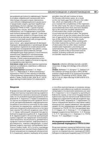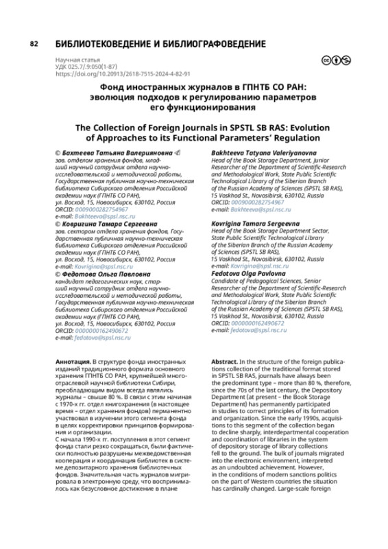 В структуре фонда иностранных изданий традиционного формата основного хранения ГПНТБ СО РАН, крупнейшей многоотраслевой научной библиотеки Сибири, преобладающим видом всегда являлись журналы – свыше 80 %. В связи с этим начиная с 1970-х гг. отдел книгохранения (в настоящее время – отдел хранения фондов) перманентно участвовал в изучении этого сегмента фонда в целях корректировки принципов формирования и организации. С начала 1990-х гг. поступления в этот сегмент фонда стали резко сокращаться, были фактически полностью разрушены межведомственная кооперация и координация библиотек в системе депозитарного хранения библиотечных фондов. Значительная часть журналов мигрировала в электронную среду, что воспринималось как безусловное достижение в плане расширения доступности информации. Однако в условиях современной санкционной политики Запада ситуация в корне изменилась: с российского информационного рынка ушли и продолжают уходить крупные зарубежные провайдеры. В итоге в фонде иностранных журналов ГПНТБ СО РАН, с одной стороны, образовались лакуны, восполнить которые невозможно, как и поддерживать в дальнейшем полноту репертуара, с другой – в нем еще немало изданий, значимость которых более чем сомнительна вследствие устаревания информации и отсутствия какой-либо исторической или культурной ценности.