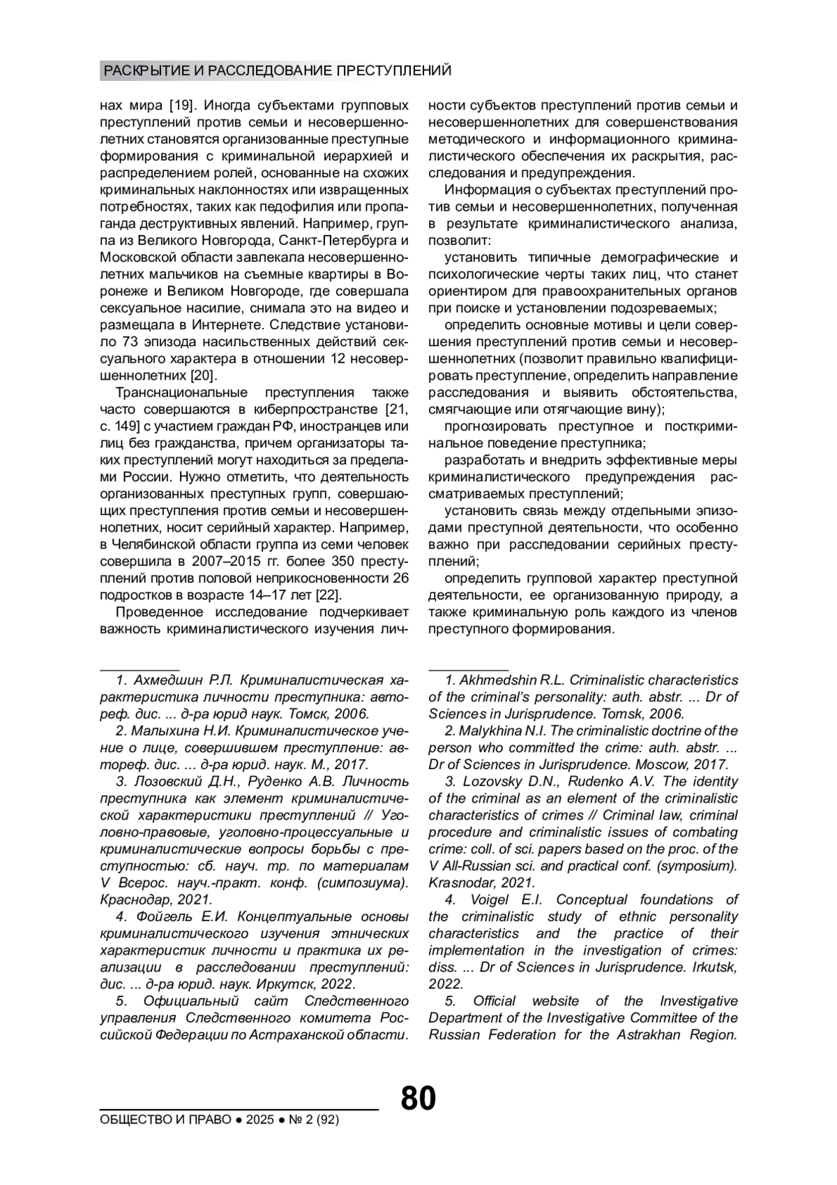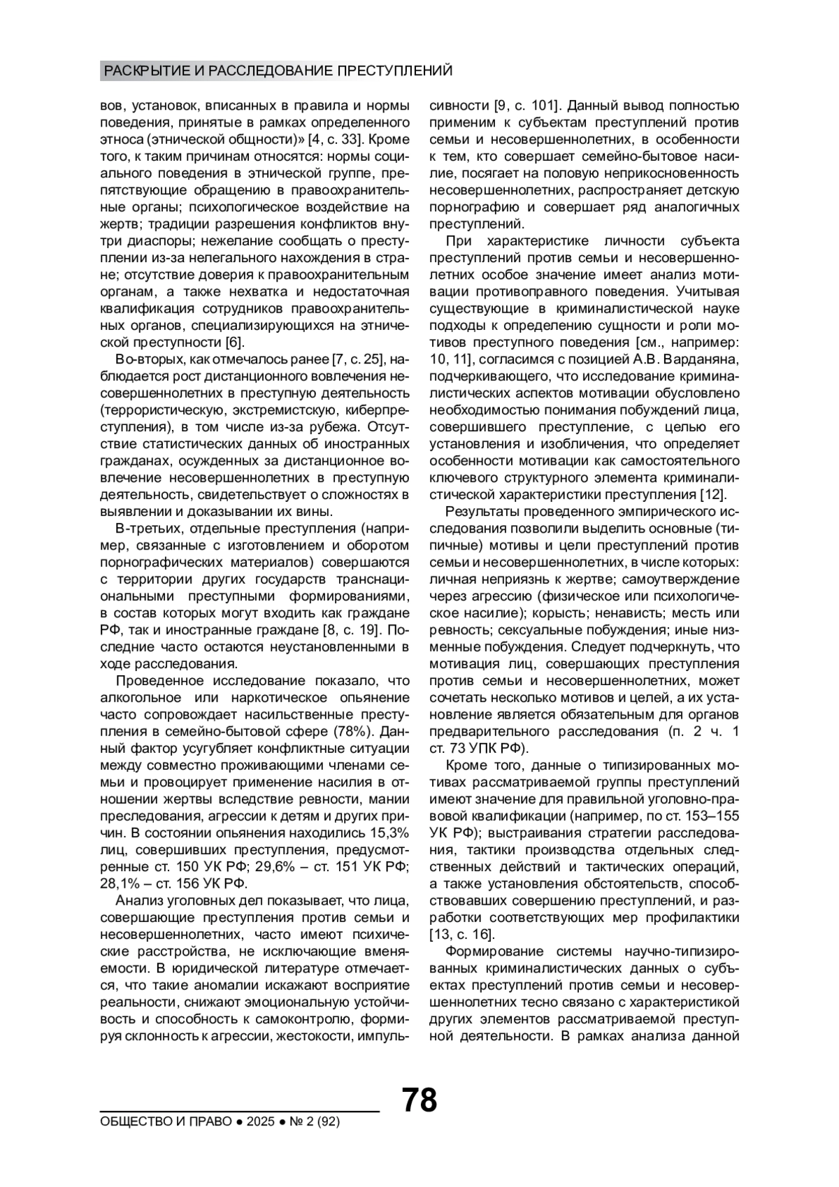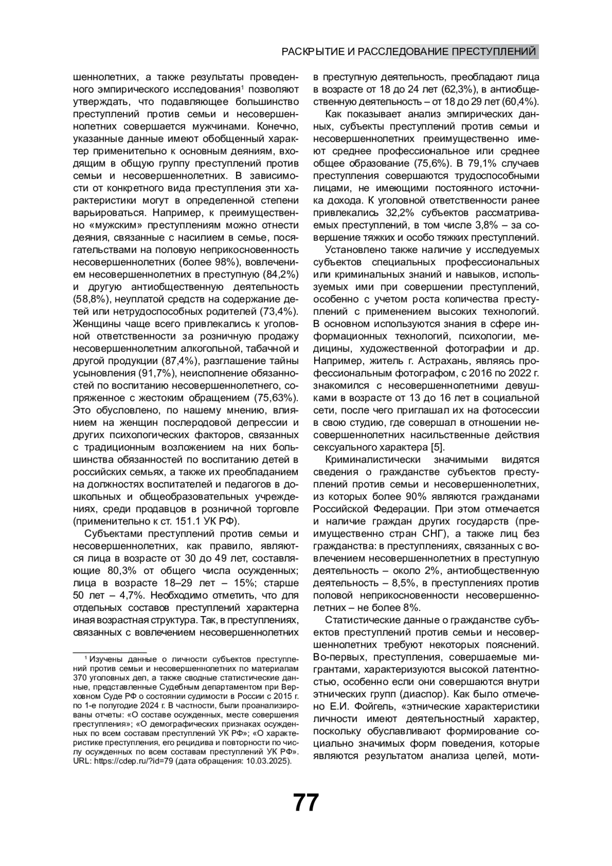 Статья: ХАРАКТЕРИСТИКА ЛИЧНОСТИ СУБЪЕКТОВ ПРЕСТУПЛЕНИЙ ПРОТИВ СЕМЬИ И НЕСОВЕРШЕННОЛЕТНИХ В СИСТЕМЕ КРИМИНАЛИСТИЧЕСКОГО ОБЕСПЕЧЕНИЯ ИХ РАССЛЕДОВАНИЯ И ПРЕДУПРЕЖДЕНИЯ (2025)