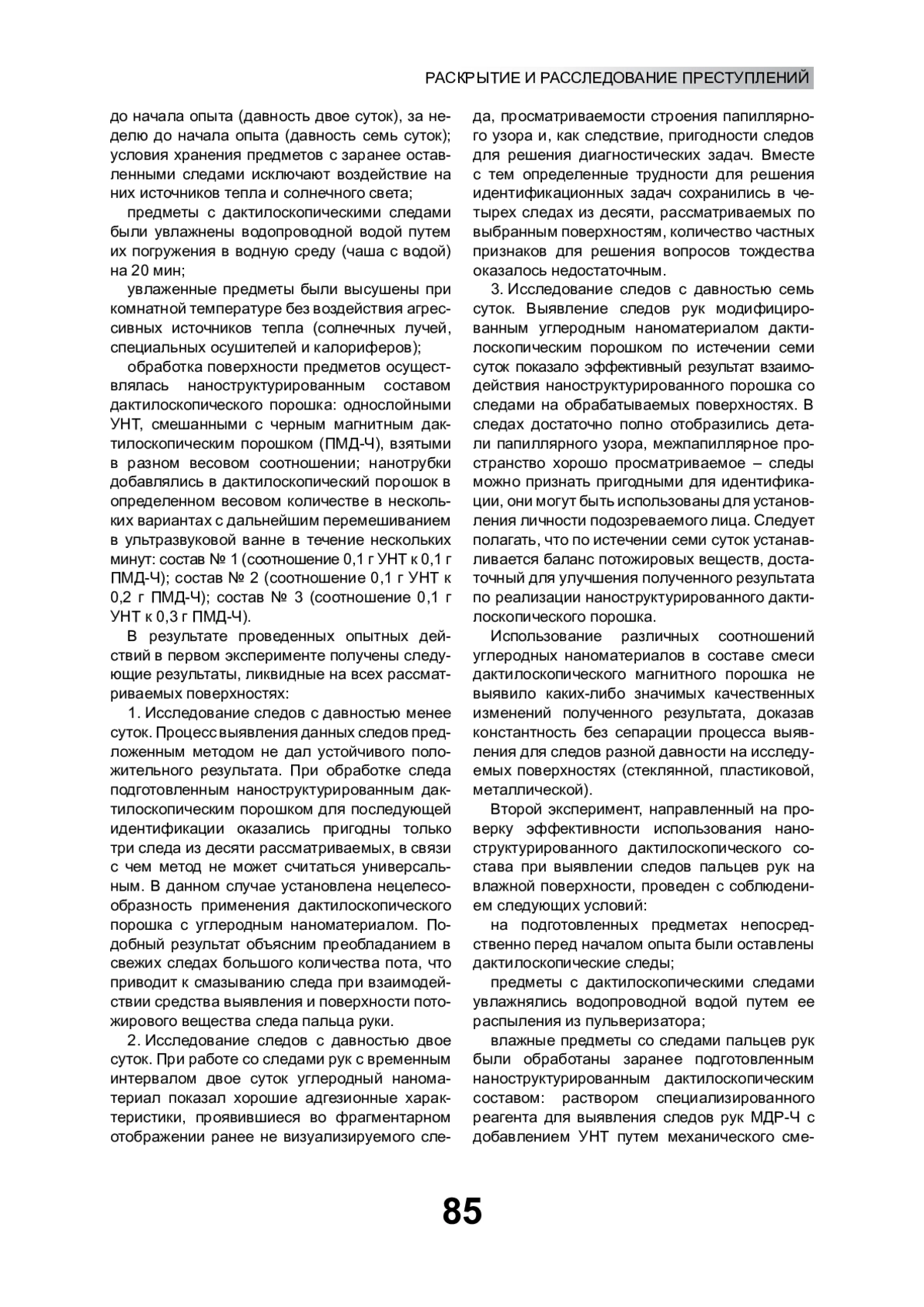В статье проанализированы возможности использования средств на основе углеродного наноматериала для выявления следов пальцев рук на сложных поверхностях. Определены приоритетные направления применения наномодифицированных средств как важного элемента в раскрытии и расследовании преступлений