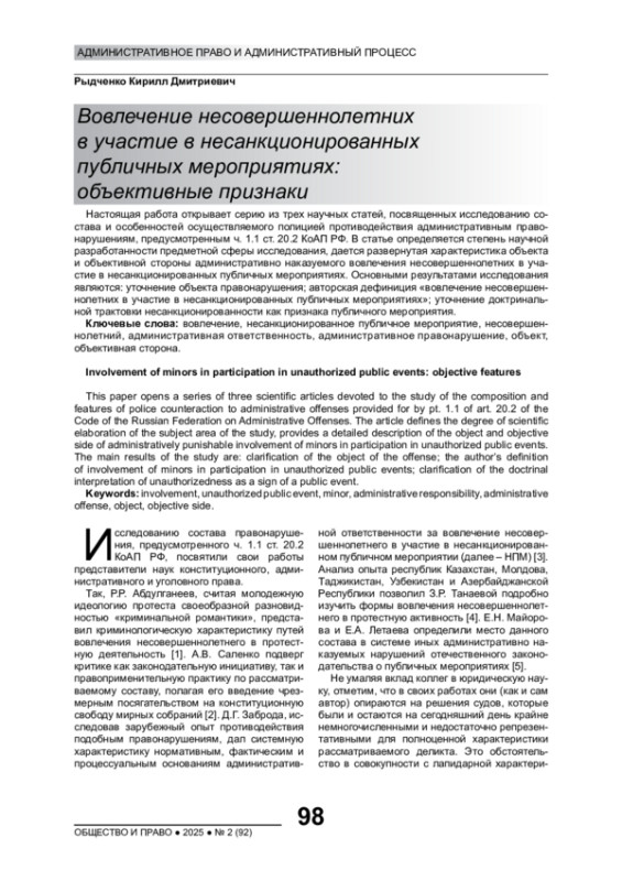Настоящая работа открывает серию из трех научных статей, посвященных исследованию состава и особенностей осуществляемого полицией противодействия административным правонарушениям, предусмотренным ч. 1.1 ст. 20.2 КоАП РФ. В статье определяется степень научной разработанности предметной сферы исследования, дается развернутая характеристика объекта и объективной стороны административно наказуемого вовлечения несовершеннолетних в участие в несанкционированных публичных мероприятиях. Основными результатами исследования являются: уточнение объекта правонарушения; авторская дефиниция «вовлечение несовершеннолетних в участие в несанкционированных публичных мероприятиях»; уточнение доктринальной трактовки несанкционированности как признака публичного мероприятия.
