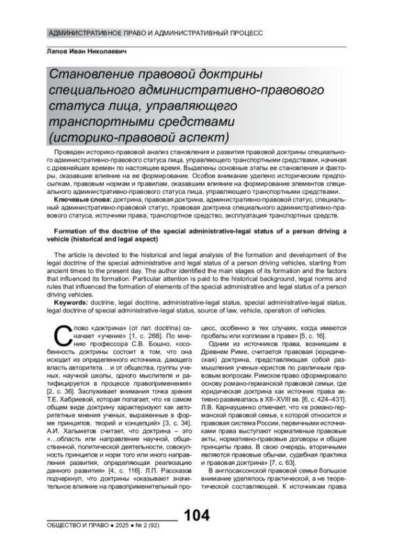 Проведен историко-правовой анализ становления и развития правовой доктрины специального административно-правового статуса лица, управляющего транспортными средствами, начиная с древнейших времен по настоящее время. Выделены основные этапы ее становления и факторы, оказавшие влияние на ее формирование. Особое внимание уделено историческим предпосылкам, правовым нормам и правилам, оказавшим влияние на формирование элементов специального административно-правового статуса лица, управляющего транспортными средствами.