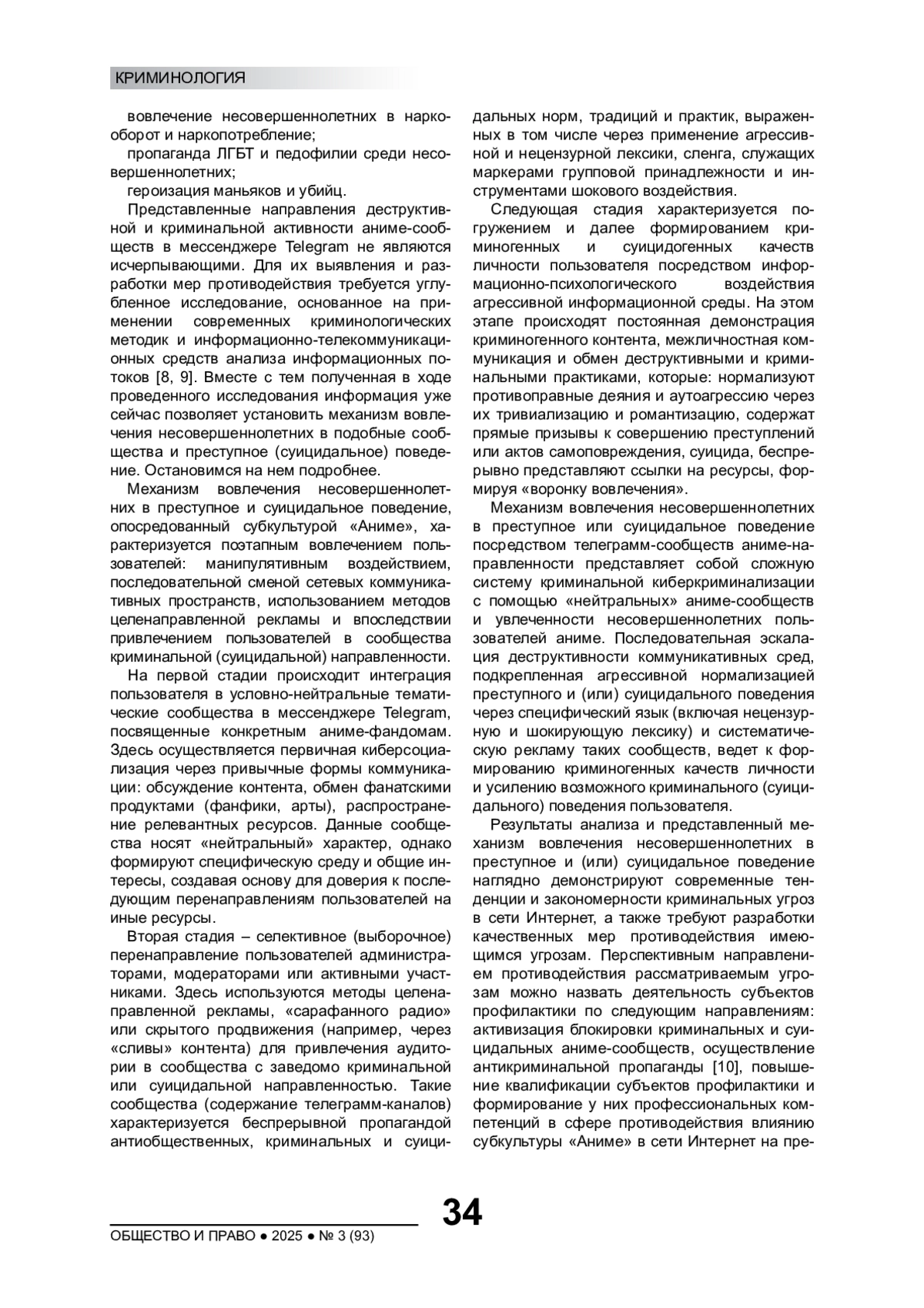 Определены понятие и признаки субкультуры «Аниме». Установлена активная интеграция отдельных аниме-сообществ в киберпространство, выявлен их криминогенный потенциал. Представлены основные направления деструктивной и криминальной активности аниме-сообществ в сети Интернет. Описан механизм вовлечения несовершеннолетних в преступное или суицидальное поведение (интеграция в нейтральные фандомы, селективное перенаправление в криминальные среды, формирование криминогенных и суицидогенных качеств личности пользователя), разработаны основные направления антикриминальной практики в этой сфере