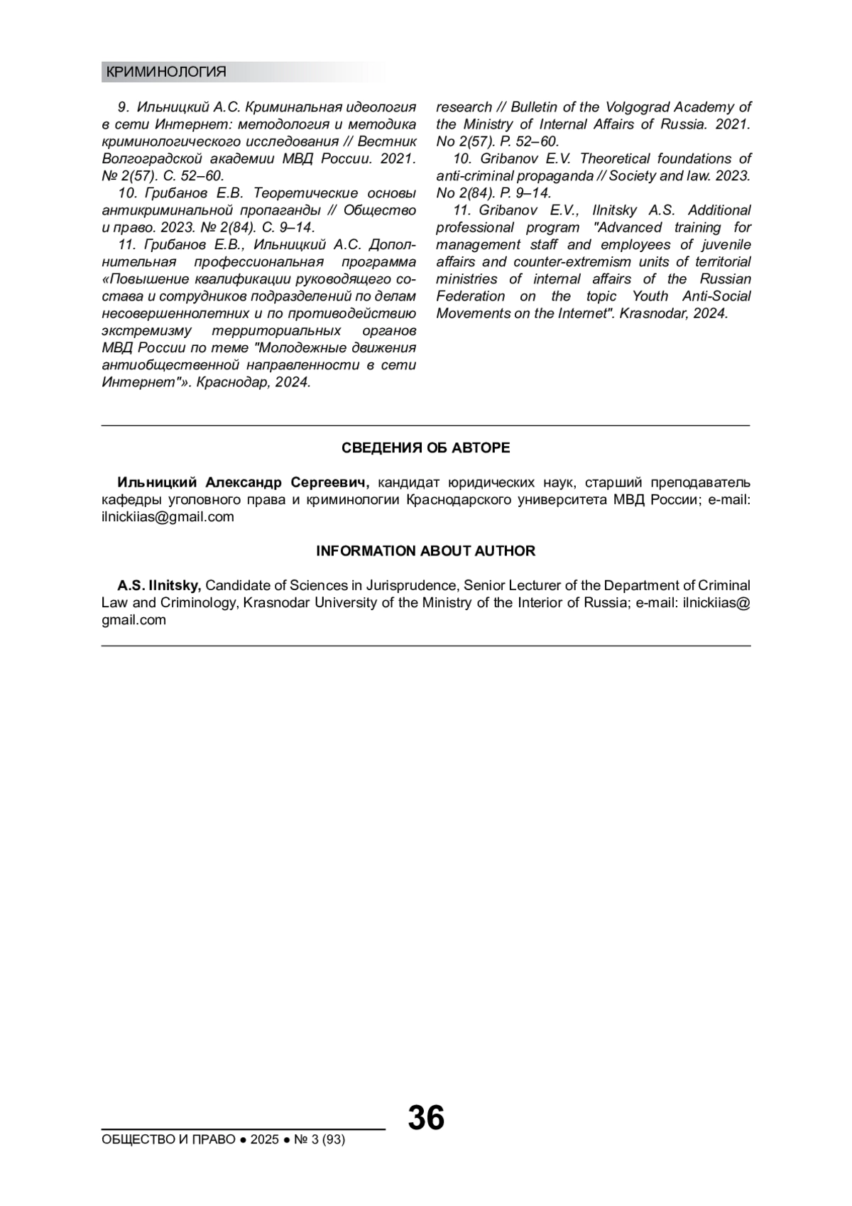 9. Ильницкий А.С. Криминальная идеология в сети Интернет: методология и методика криминологического исследования // Вестник Волгоградской академии МВД России. 2021. № 2(57). С. 52-60. EDN: FHFEHN