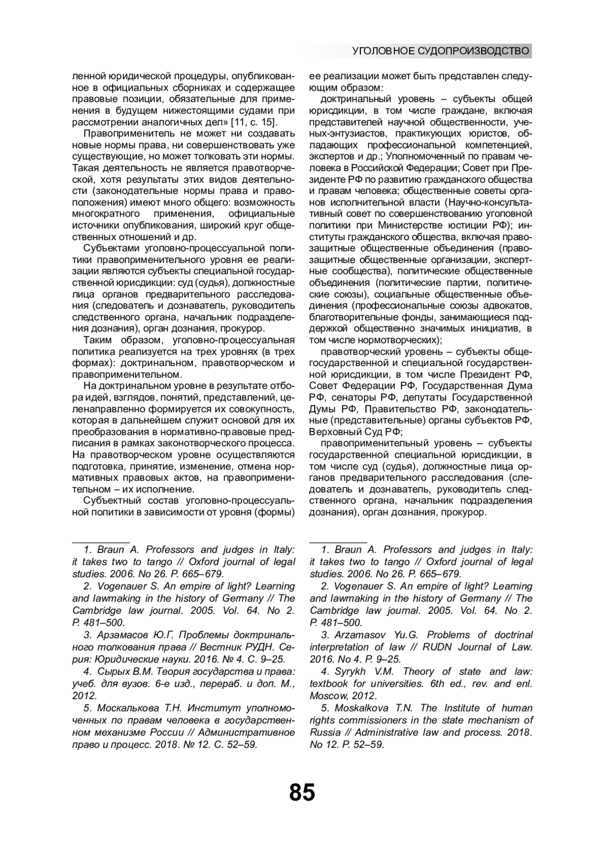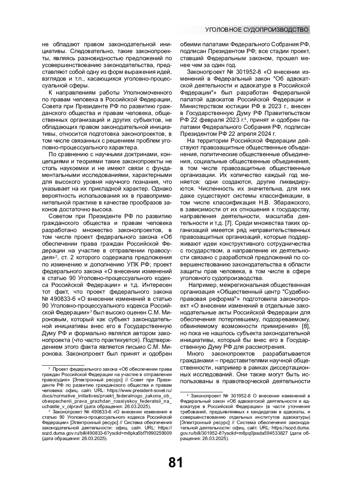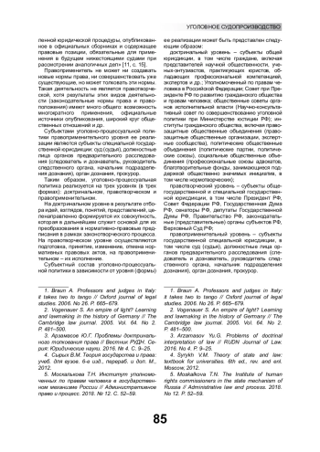 Ключевые фразы: уголовно-процессуальная политика, формы реализации, доктринальный уровень, ПРАВОПРИМЕНЕНИЕ, правотворческий процесс, судебная практика, общественные советы, гражданское общество, уголовное судопроизводство, субъекты законодательной инициативы