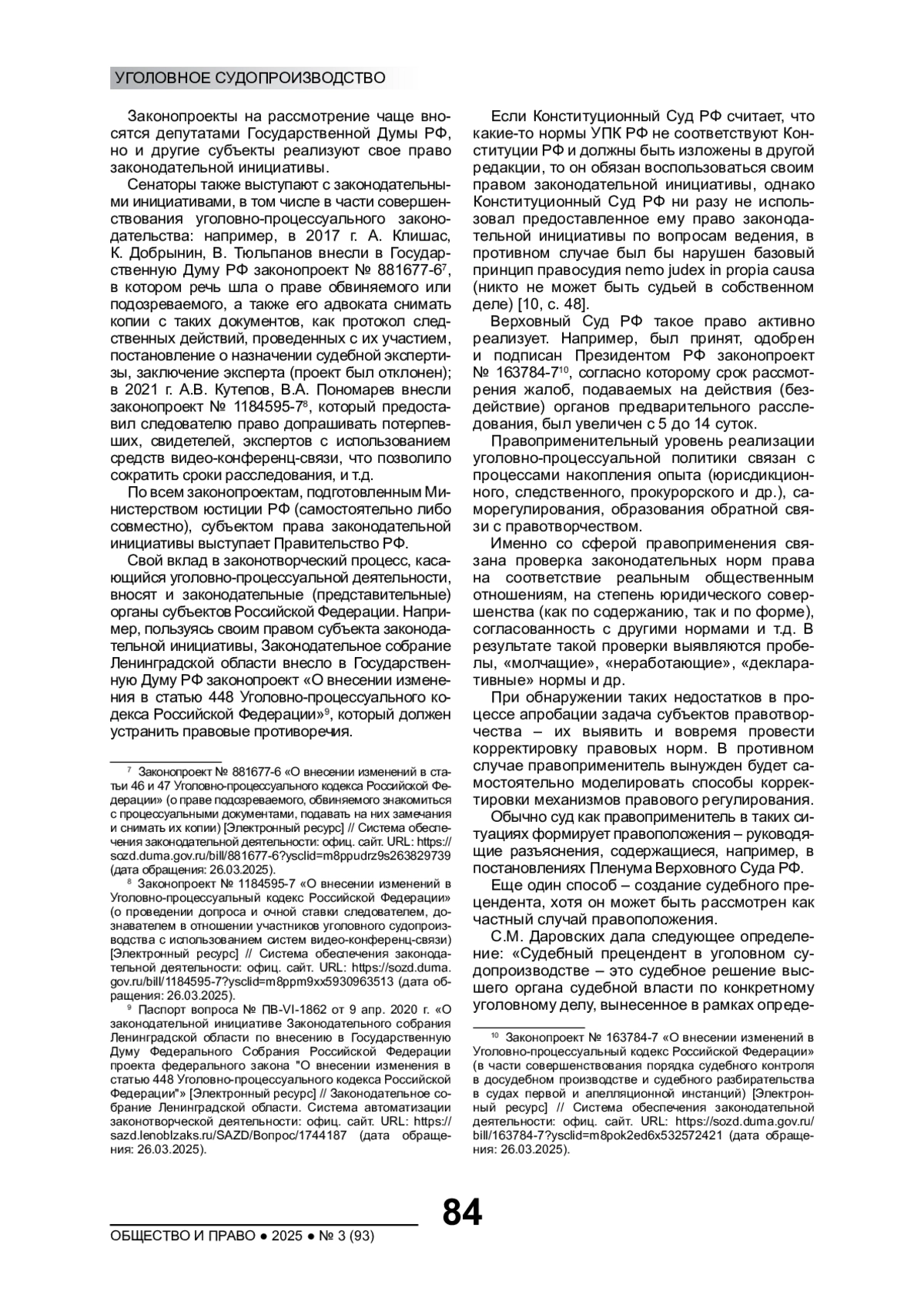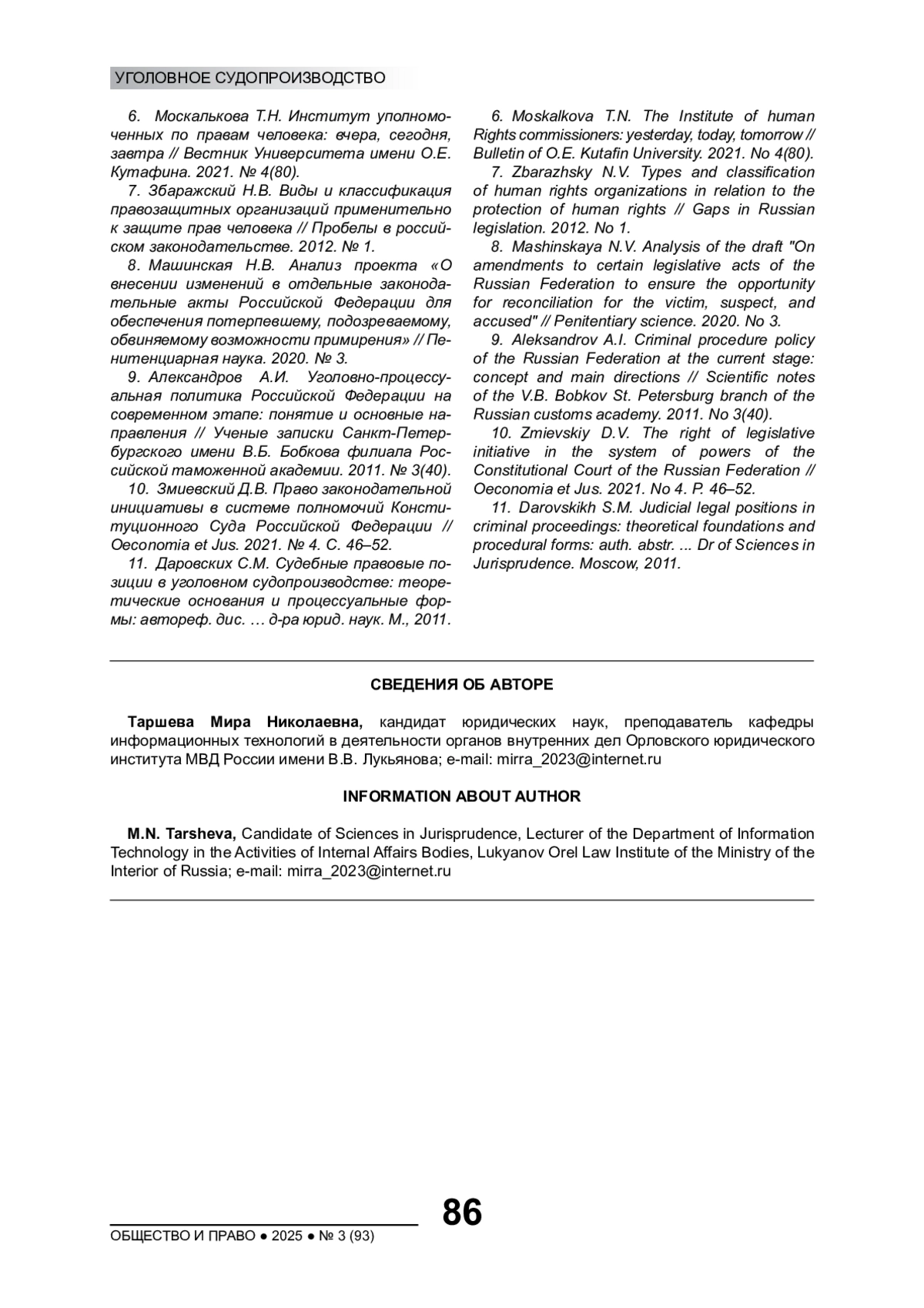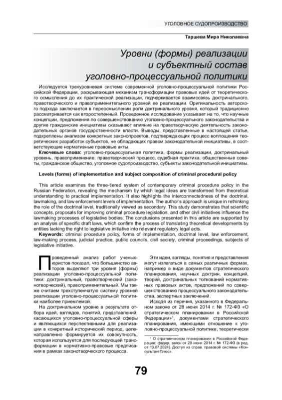 ТАРШЕВА М. Н. УРОВНИ (ФОРМЫ) РЕАЛИЗАЦИИ И СУБЪЕКТНЫЙ СОСТАВ УГОЛОВНО-ПРОЦЕССУАЛЬНОЙ ПОЛИТИКИ // ОБЩЕСТВО И ПРАВО. 2025. № 3 (93)