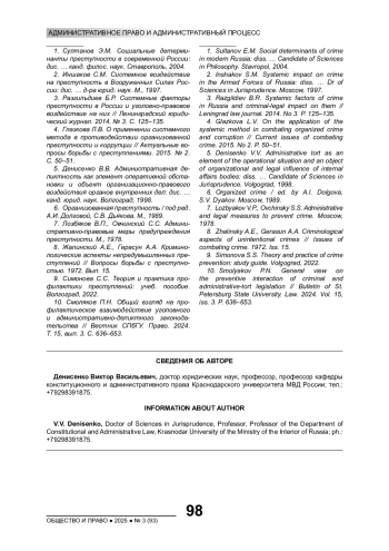 5. Денисенко В.В. Административная деликтность как элемент оперативной обстановки и объект организационно-правового воздействия органов внутренних дел: дис. … канд. юрид. наук. Волгоград, 1998. EDN: MCMHWA