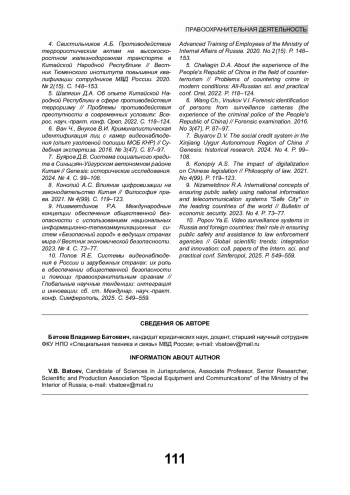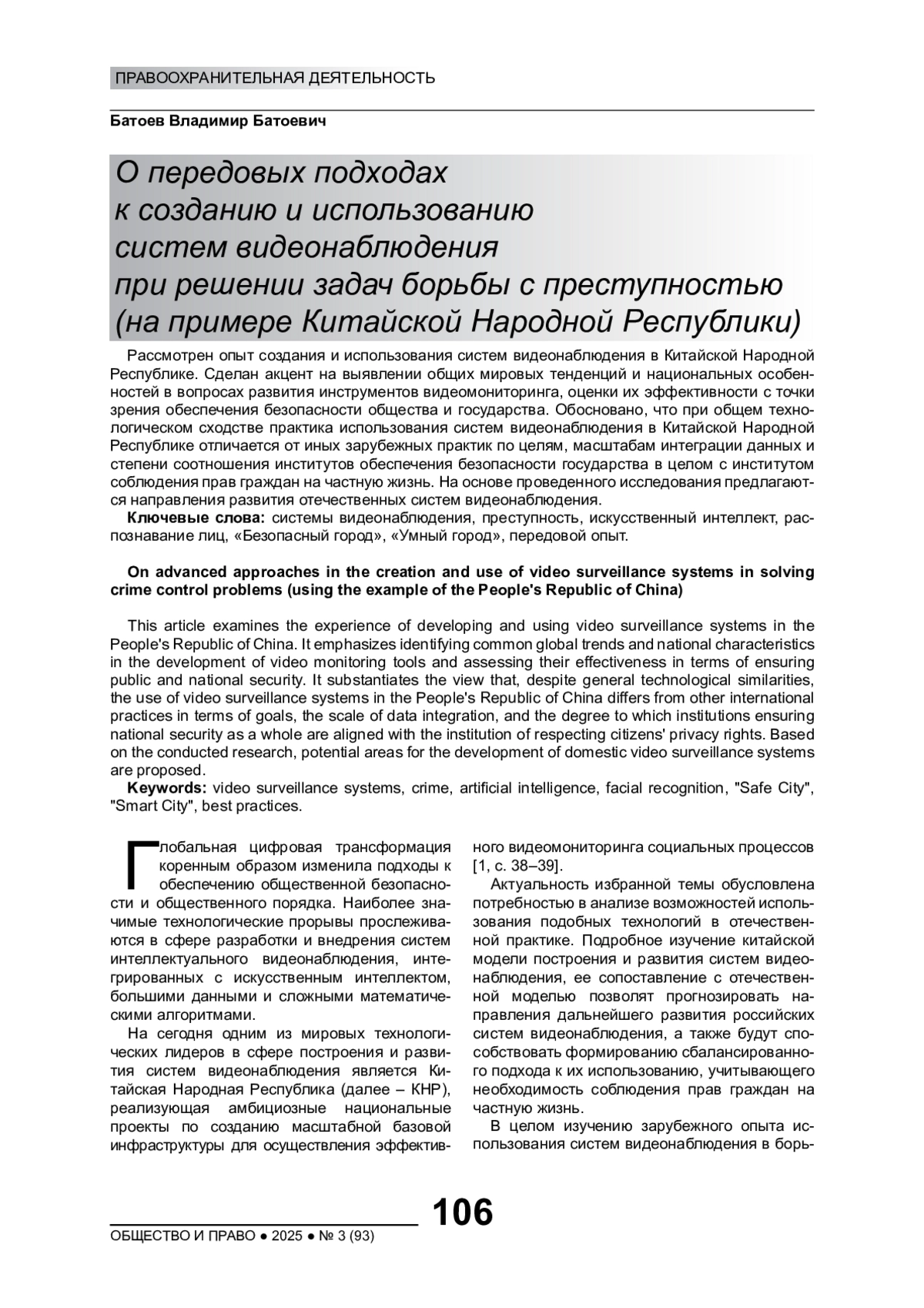 БАТОЕВ В. Б. О ПЕРЕДОВЫХ ПОДХОДАХ К СОЗДАНИЮ И ИСПОЛЬЗОВАНИЮ СИСТЕМ ВИДЕОНАБЛЮДЕНИЯ ПРИ РЕШЕНИИ ЗАДАЧ БОРЬБЫ С ПРЕСТУПНОСТЬЮ (НА ПРИМЕРЕ КИТАЙСКОЙ НАРОДНОЙ РЕСПУБЛИКИ) // ОБЩЕСТВО И ПРАВО. 2025. № 3 (93)