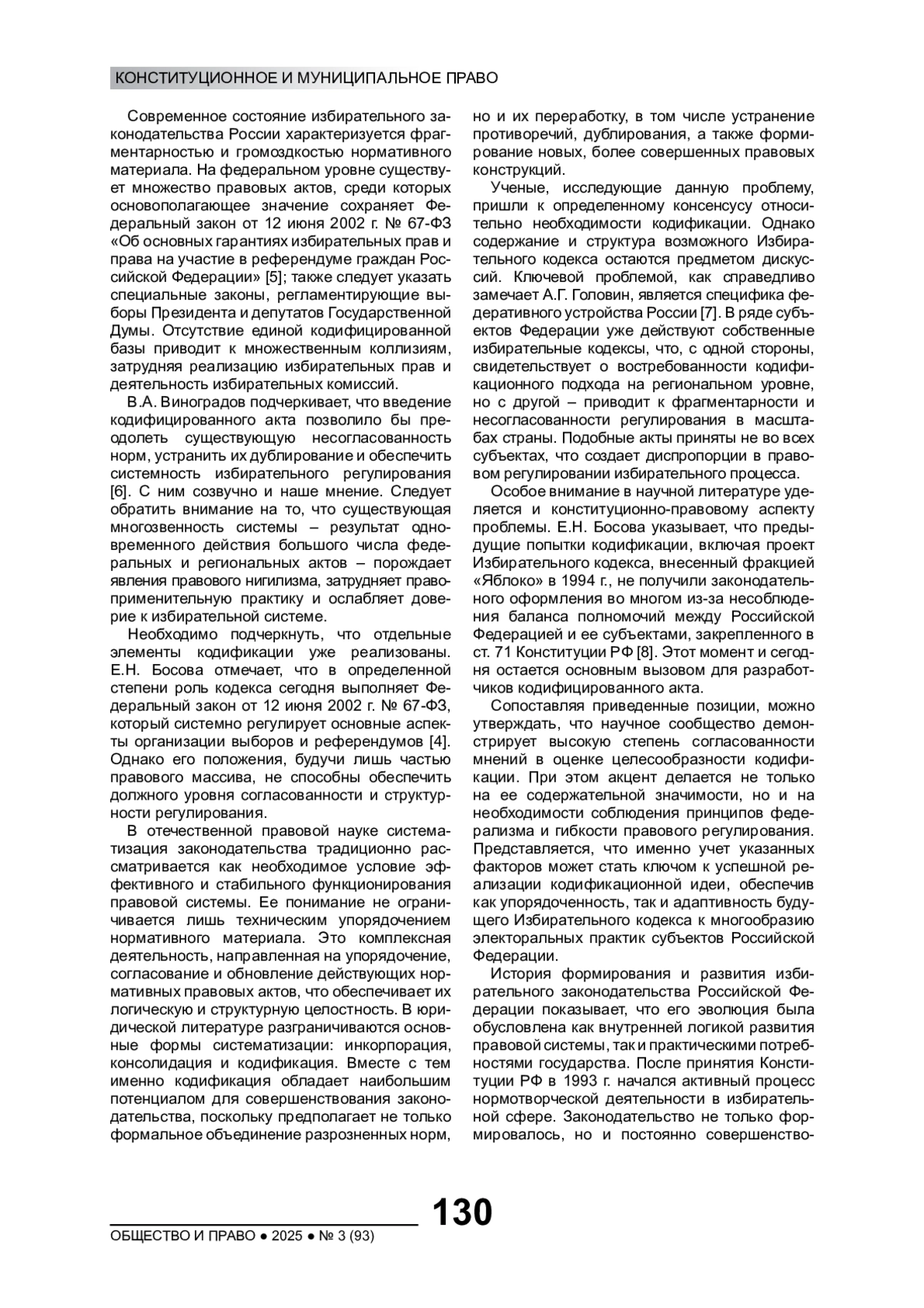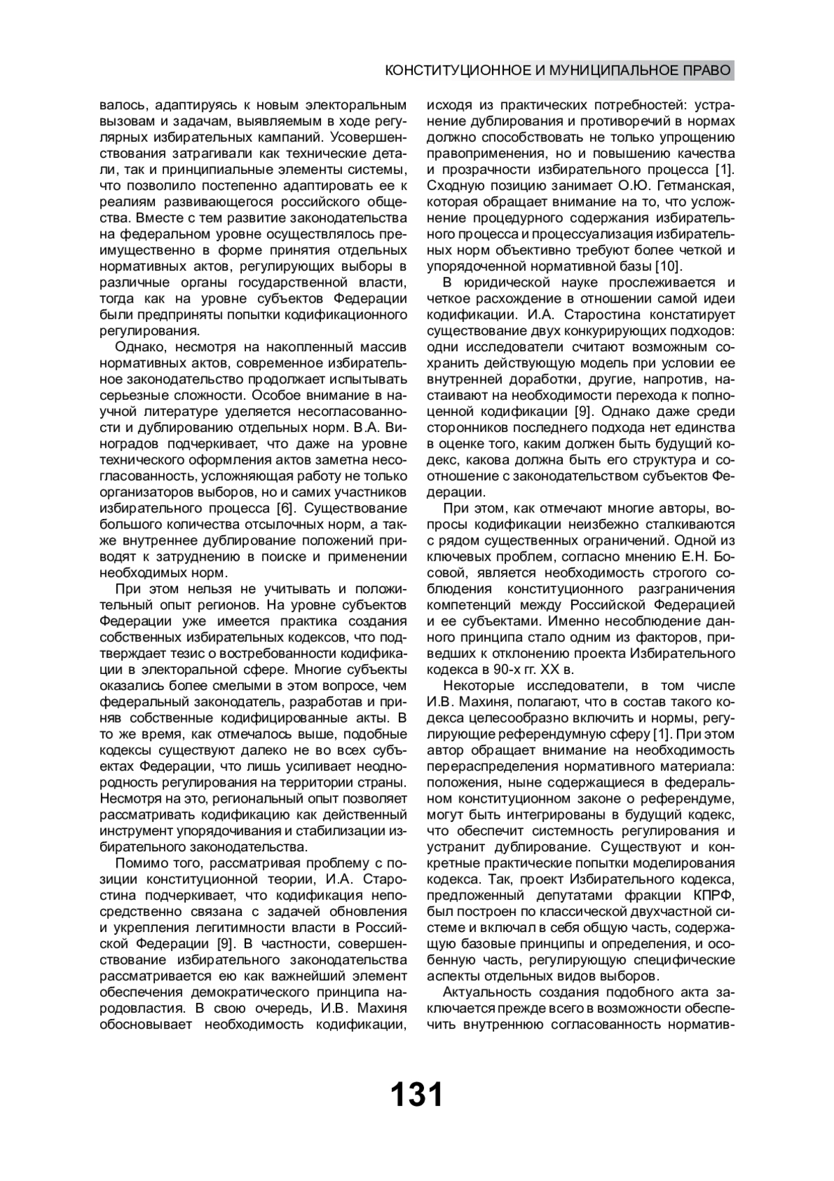 6. Виноградов В.А. Кодификация избирательного законодательства - вопрос актуальный // Гражданин. Выборы. Власть. 2016. № 4. С. 43-45. EDN: ZSHADL