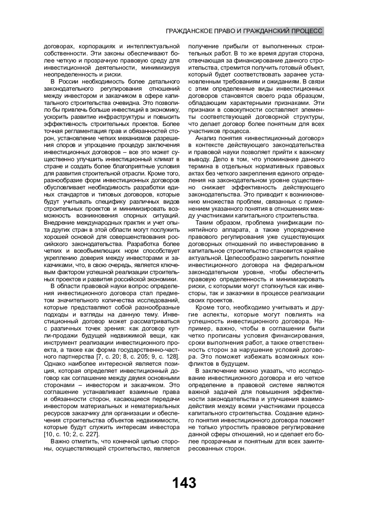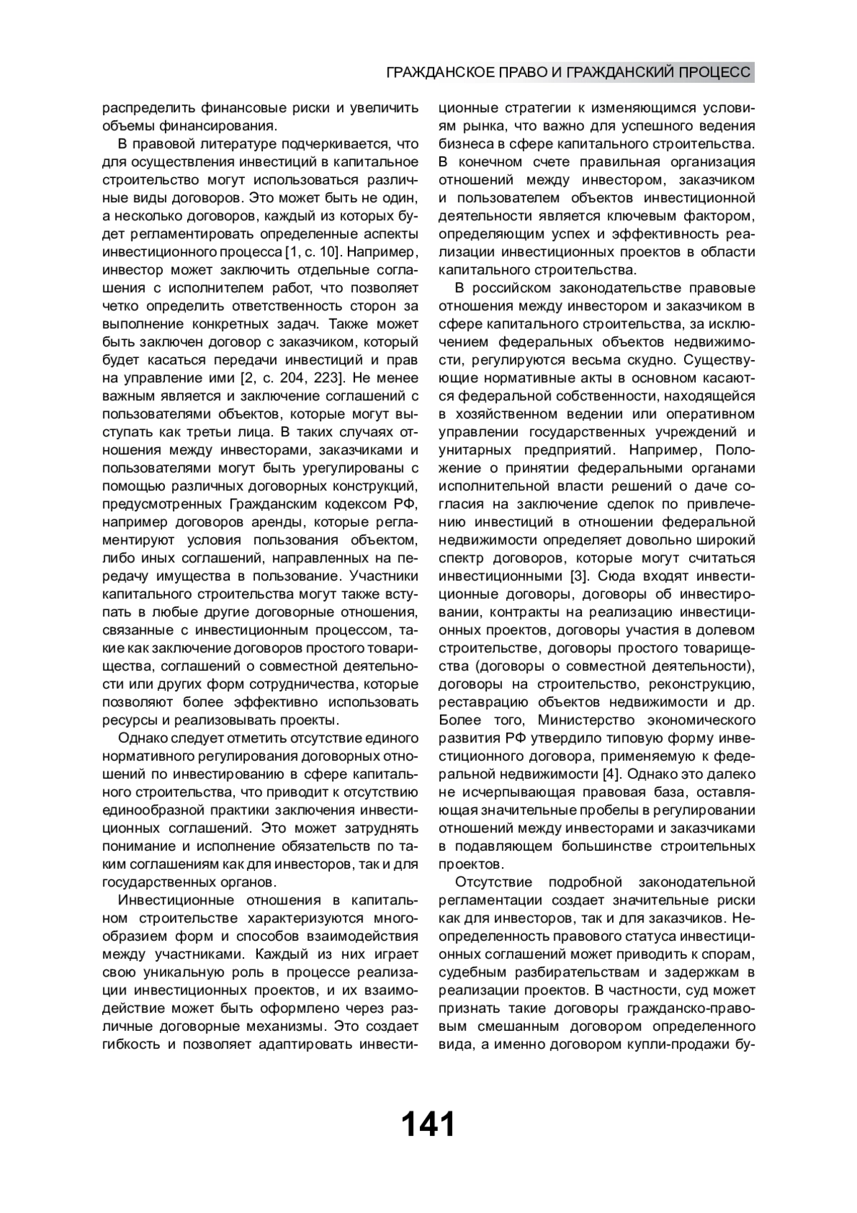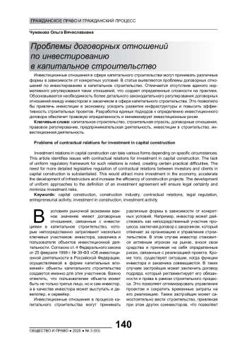 Инвестиционные отношения в сфере капитального строительства могут принимать различные формы в зависимости от конкретных условий. В статье выявляются проблемы договорных отношений по инвестированию в капитальное строительство. Отмечается отсутствие единого нормативного регулирования таких отношений, что создает определенные сложности на практике. Обосновывается необходимость более детального законодательного регулирования договорных отношений между инвестором и заказчиком в сфере капитального строительства. Это позволило бы привлечь инвестиции в экономику, ускорить развитие инфраструктуры и повысить эффективность строительных проектов. Разработка единых подходов к определению инвестиционного договора обеспечит правовую определенность и минимизирует инвестиционные риски