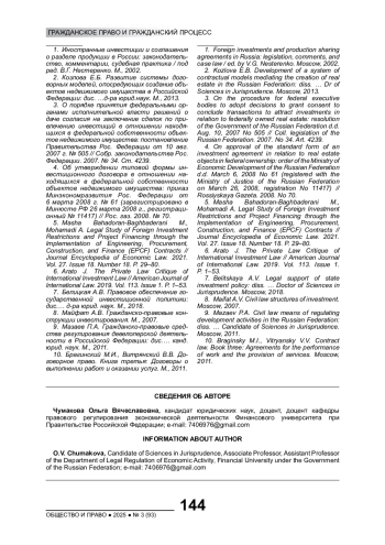 5. Masha Bahadoran-Baghbaderani M., Mohamadi A. Legal Study of Foreign Investment Restrictions and Project Financing through the Implementation of Engineering, Procurement, Construction, and Finance (EPCF) Contracts // Journal Encyclopedia of Economic Law. 2021. Vol. 27. Issue 18. Number 18. P. 29-80.