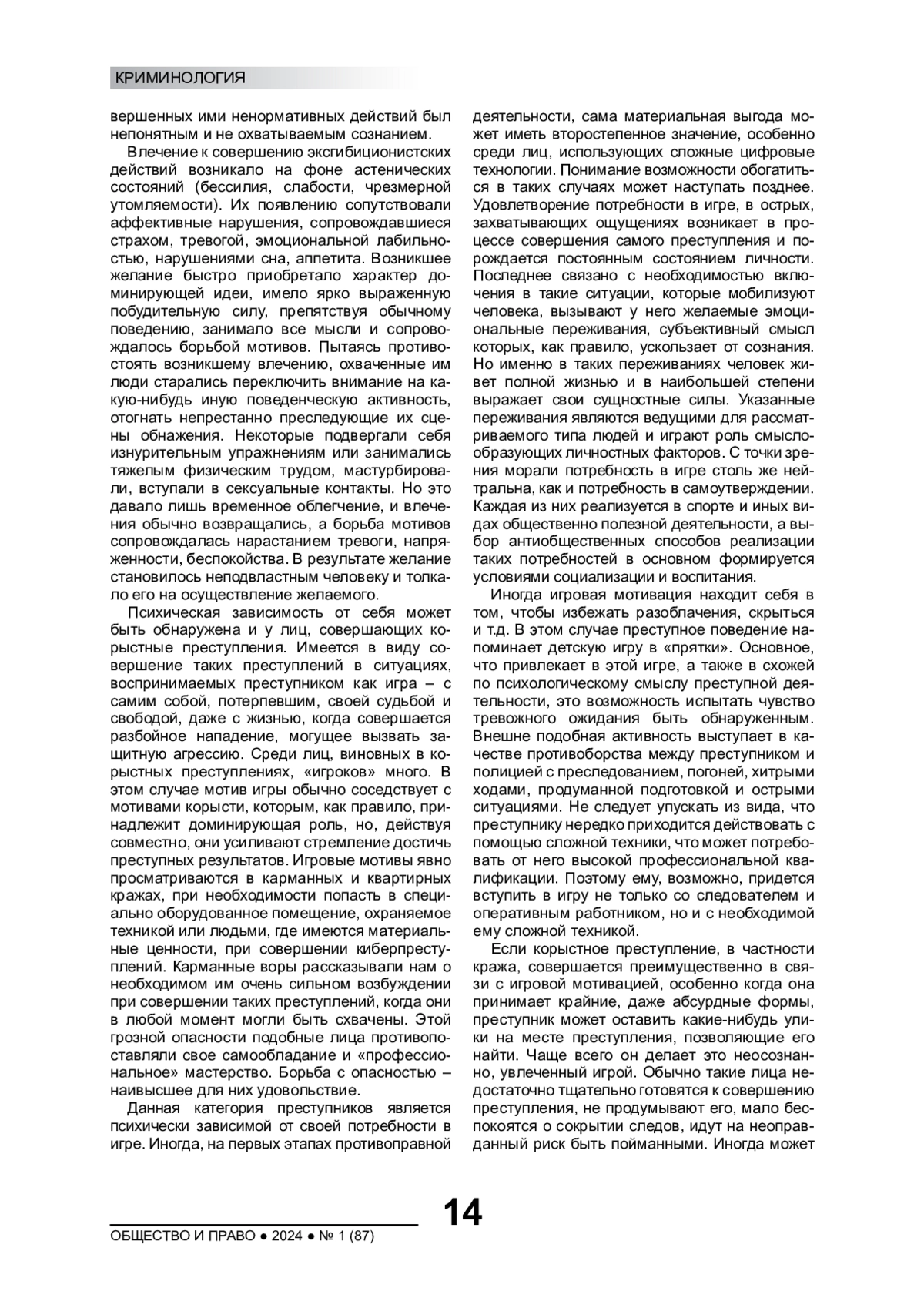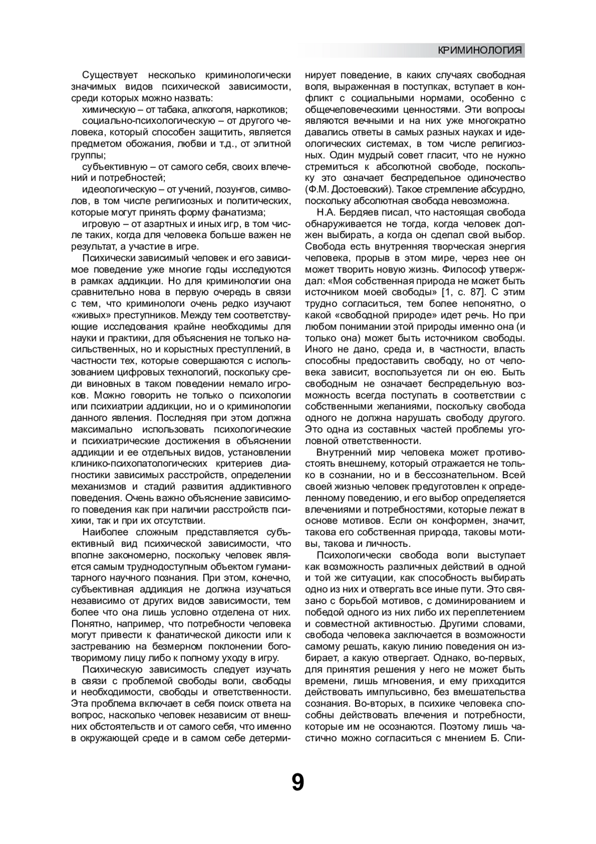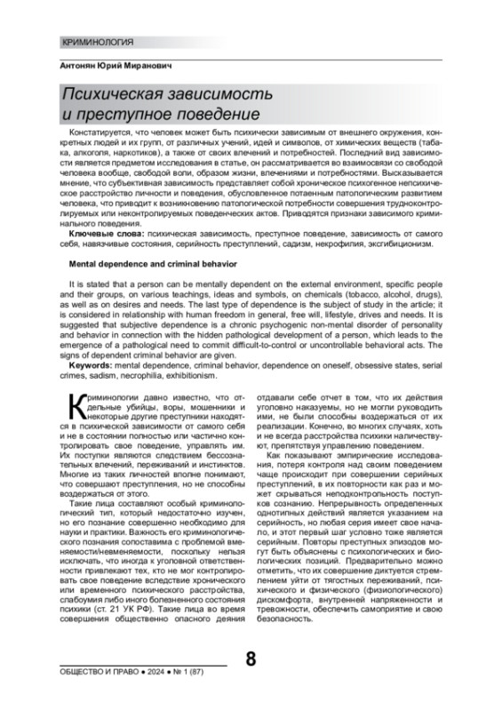 Констатируется, что человек может быть психически зависимым от внешнего окружения, конкретных людей и их групп, от различных учений, идей и символов, от химических веществ (табака, алкоголя, наркотиков), а также от своих влечений и потребностей. Последний вид зависимости является предметом исследования в статье, он рассматривается во взаимосвязи со свободой человека вообще, свободой воли, образом жизни, влечениями и потребностями. Высказывается мнение, что субъективная зависимость представляет собой хроническое психогенное непсихическое расстройство личности и поведения, обусловленное потаенным патологическим развитием человека, что приводит к возникновению патологической потребности совершения трудноконтролируемых или неконтролируемых поведенческих актов. Приводятся признаки зависимого криминального поведения.