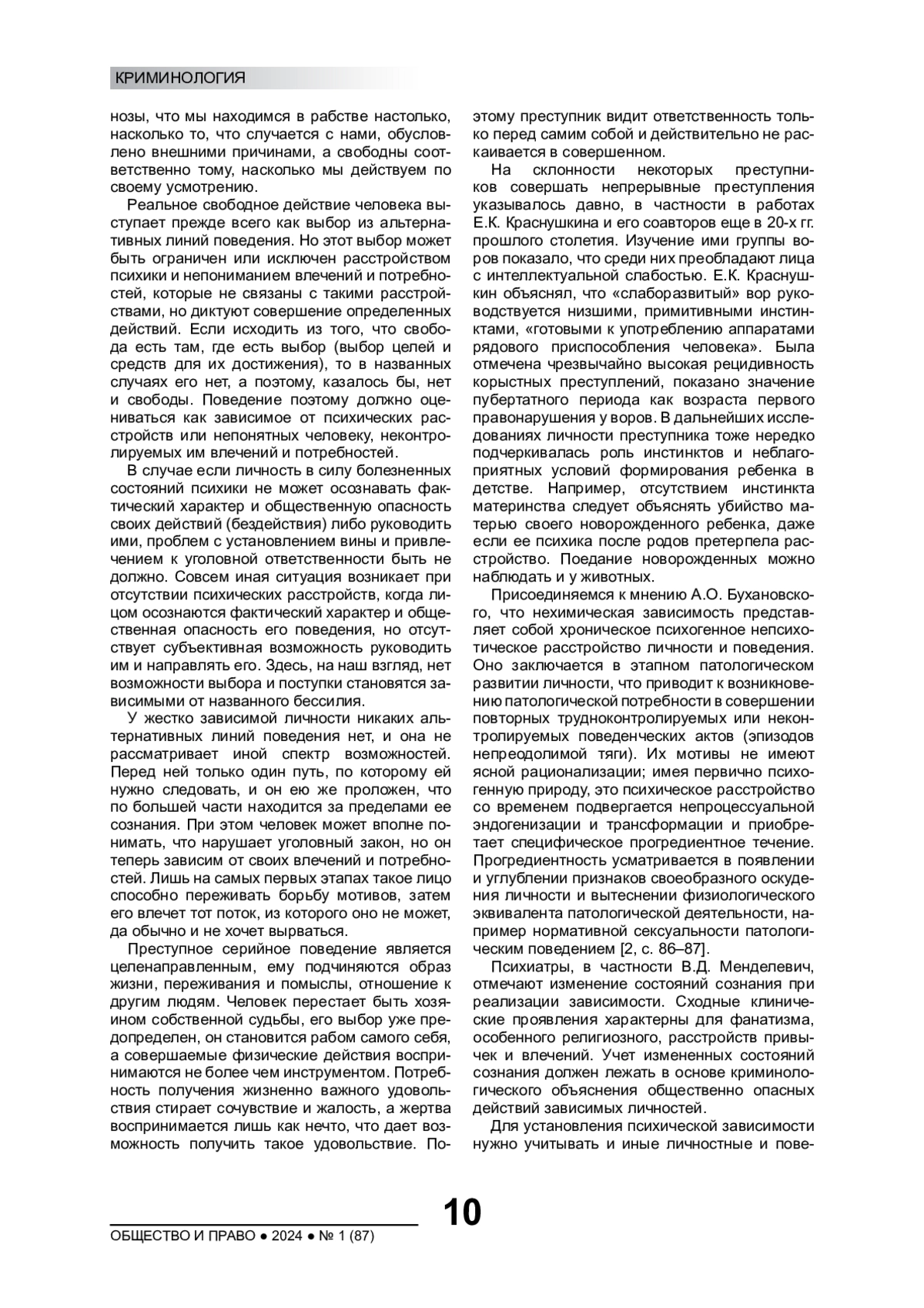 Криминологии давно известно, что отдельные убийцы, воры, мошенники и некоторые другие преступники находятся в психической зависимости от самого себя и не в состоянии полностью или частично контролировать свое поведение, управлять им. Их поступки являются следствием бессознательных влечений, переживаний и инстинктов. Многие из таких личностей вполне понимают, что совершают преступления, но не способны воздержаться от этого