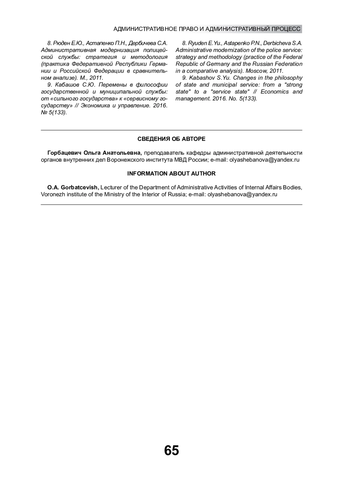 8. Рюден Е.Ю., Астапенко П.Н., Дербичева С.А. Административная модернизация полицейской службы: стратегия и методология (практика Федеративной Республики Германии и Российской Федерации в сравнительном анализе). М., 2011. EDN: QSHDWN