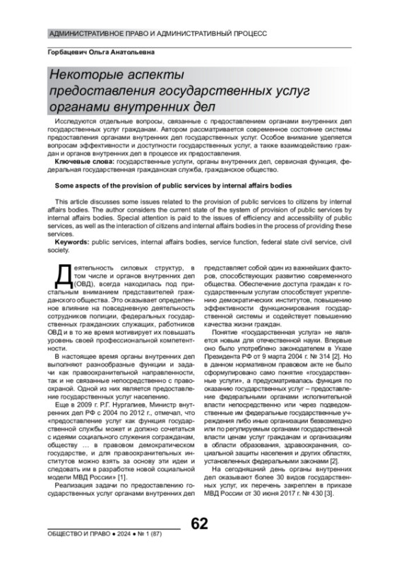 Исследуются отдельные вопросы, связанные с предоставлением органами внутренних дел государственных услуг гражданам. Автором рассматривается современное состояние системы предоставления органами внутренних дел государственных услуг. Особое внимание уделяется вопросам эффективности и доступности государственных услуг, а также взаимодействию граждан и органов внутренних дел в процессе их предоставления
