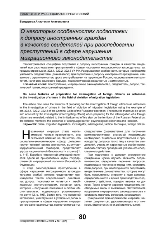 Рассматривается специфика подготовки к допросу иностранных граждан в качестве свидетелей при расследовании преступлений в сфере нарушения миграционного законодательства, предусмотренных ст. 322.1, 322.2, 322.3 УК РФ. Раскрываются особенности, которые необходимо учитывать следователю (дознавателю) при подготовке к допросу иностранного гражданина, связанные с ограниченностью срока его пребывания на территории России, национальным менталитетом, наличием языкового барьера, психологической закрытостью и замкнутостьюм