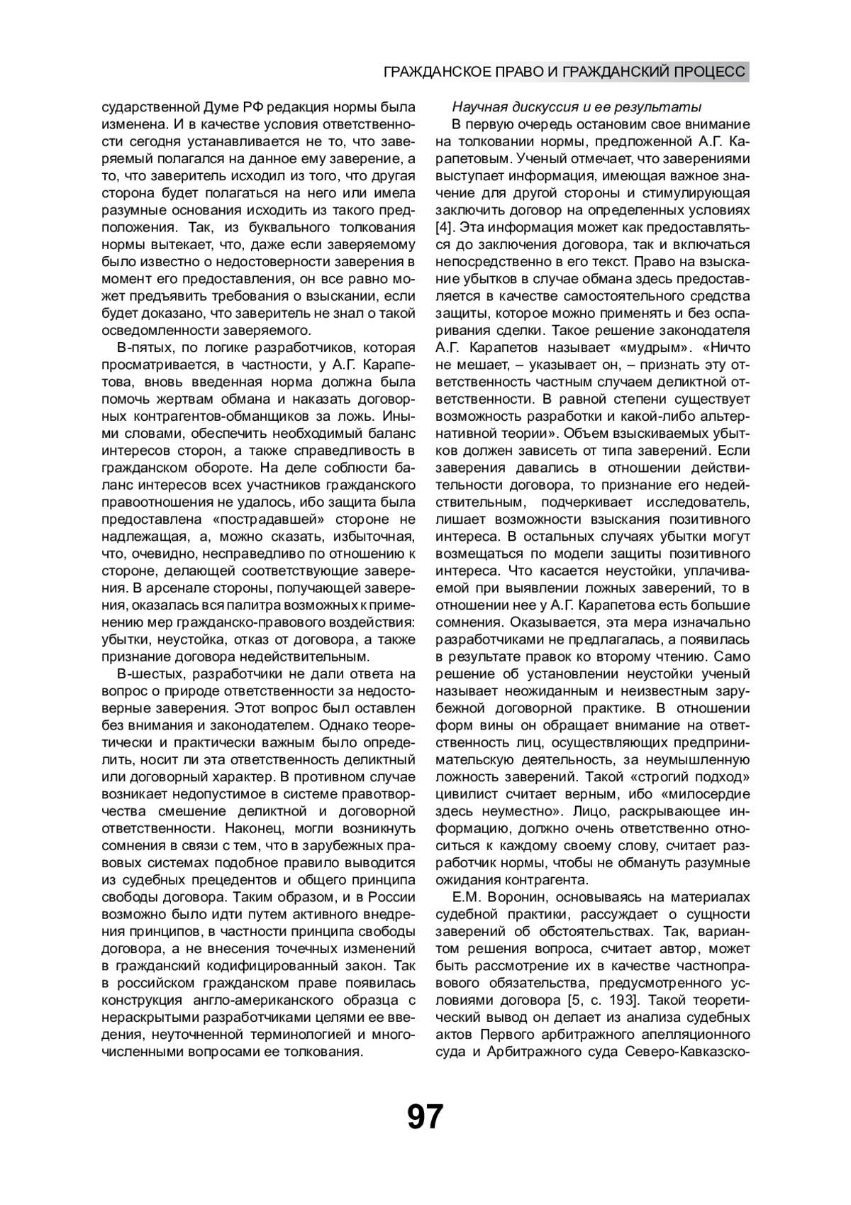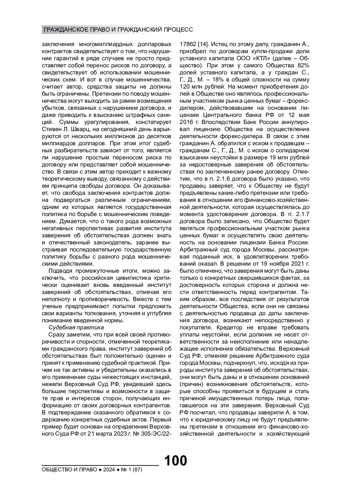 10. Кратенко М.В. Недостоверность заверений как основание для оспаривания сделки: первый опыт применения судами статьи 431.2 Гражданского кодекса Российской Федерации // Судья. 2020. № 7. EDN: EZGFFV
