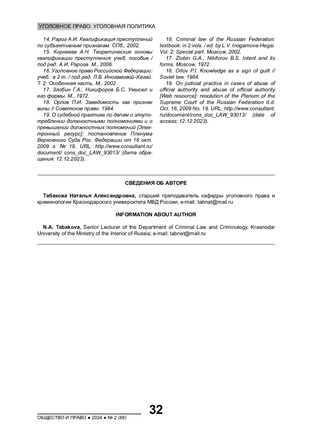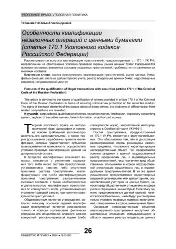 ТАБАКОВА Н. А. ОСОБЕННОСТИ КВАЛИФИКАЦИИ НЕЗАКОННЫХ ОПЕРАЦИЙ С ЦЕННЫМИ БУМАГАМИ (СТАТЬЯ 170.1 УГОЛОВНОГО КОДЕКСА РОССИЙСКОЙ ФЕДЕРАЦИИ) // ОБЩЕСТВО И ПРАВО. 2024. № 2 (88)