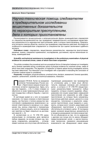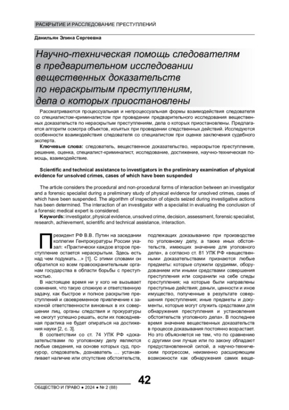 Рассматриваются процессуальная и непроцессуальная формы взаимодействия следователя со специалистом-криминалистом при проведении предварительного исследования вещественных доказательств по нераскрытым преступлениям, дела о которых приостановлены. Предлагается алгоритм осмотра объектов, изъятых при проведении следственных действий. Исследуются особенности взаимодействия следователя со специалистом при оценке заключения судебного эксперта