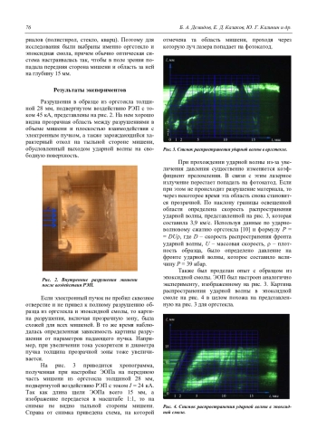 Получены теневые изображения распространения фронта ударной волны в прозрачных полимерах (на примере образцов из оргстекла и эпоксидной смолы), возбуждаемой при воздействии сильноточного электронного пучка.