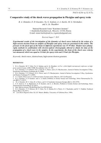 Демидов Б. А., Казаков Е. Д., Калинин Ю. Г., Курило А. А., Стрижаков М. Г., Шашков А. Ю. Сравнительное исследование распространения ударных волн в оргстекле и эпоксидной смоле 74