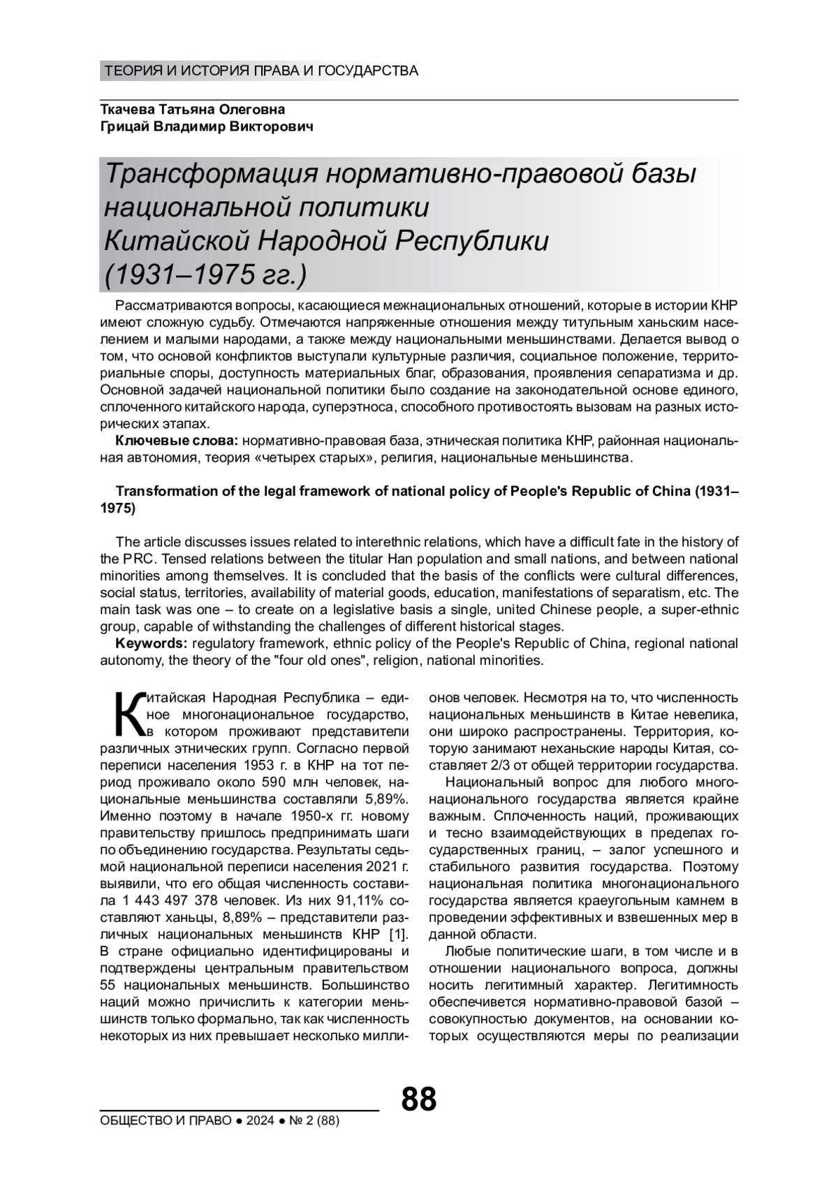 Китайская Народная Республика – единое многонациональное государство, в котором проживают представители различных этнических групп. Согласно первой переписи населения 1953 г. в КНР на тот период проживало около 590 млн человек, национальные меньшинства составляли 5,89%. Именно поэтому в начале 1950-х гг. новому правительству пришлось предпринимать шаги по объединению государства. Результаты седьмой национальной переписи населения 2021 г. выявили, что его общая численность составила 1 443 497 378 человек. Из них 91,11% составляют ханьцы, 8,89% – представители различных национальных меньшинств КНР
