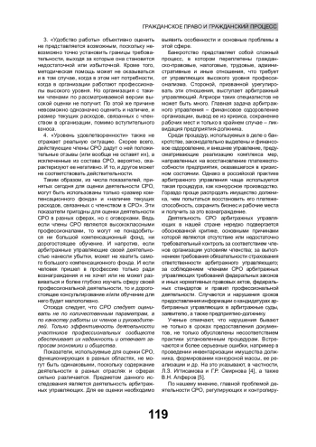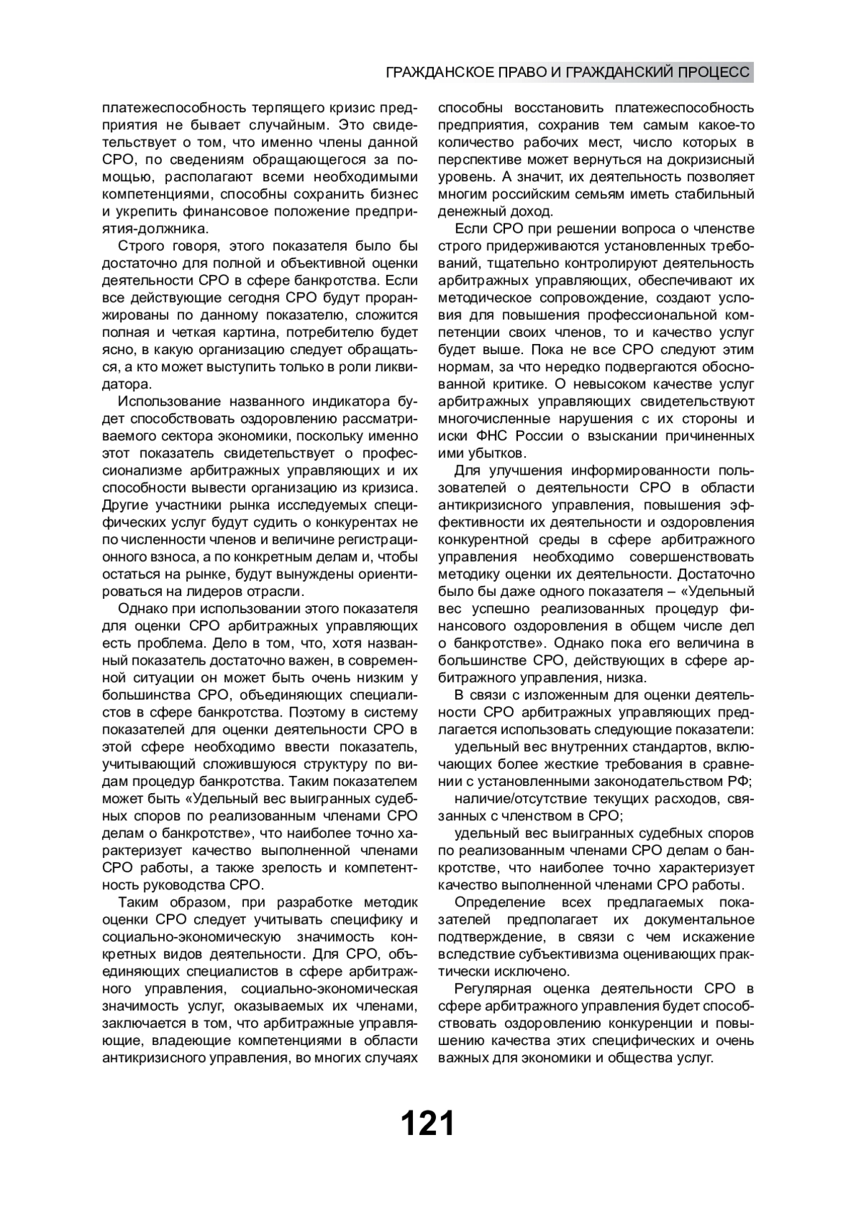 Оценивается действующая методика, используемая для ранжирования саморегулируемых организаций, результаты которого приводятся на информационно-консультационном портале саморегулируемых организаций. Доказывается, что большинство используемых показателей непригодны для объективной оценки, поскольку одни не имеют однозначной интерпретации (продолжительный срок рассмотрения документов соискателей может свидетельствовать как о существовании административных барьеров, так и о более высокой требовательности при проверке поступивших документов), другие противоречат друг другу (число членов организации, как правило, находится в обратной зависимости от величины регистрационного взноса), третьи подвержены сильному влиянию фактора субъективизма (отзывы членов организации об условиях деятельности в ней). Для оценки деятельности саморегулируемых организаций арбитражных управляющих предлагается использовать следующие показатели: 1) удельный вес внутренних стандартов, включающих более жесткие требования в сравнении с установленными законодательством Российской Федерации; 2) наличие/отсутствие текущих расходов, связанных с членством в саморегулируемой организации; 3) удельный вес выигранных судебных споров в делах о банкротстве. Такой подход будет способствовать оздоровлению конкурентной среды, повышению качества оказываемых услуг, что отвечает интересам экономики и общества