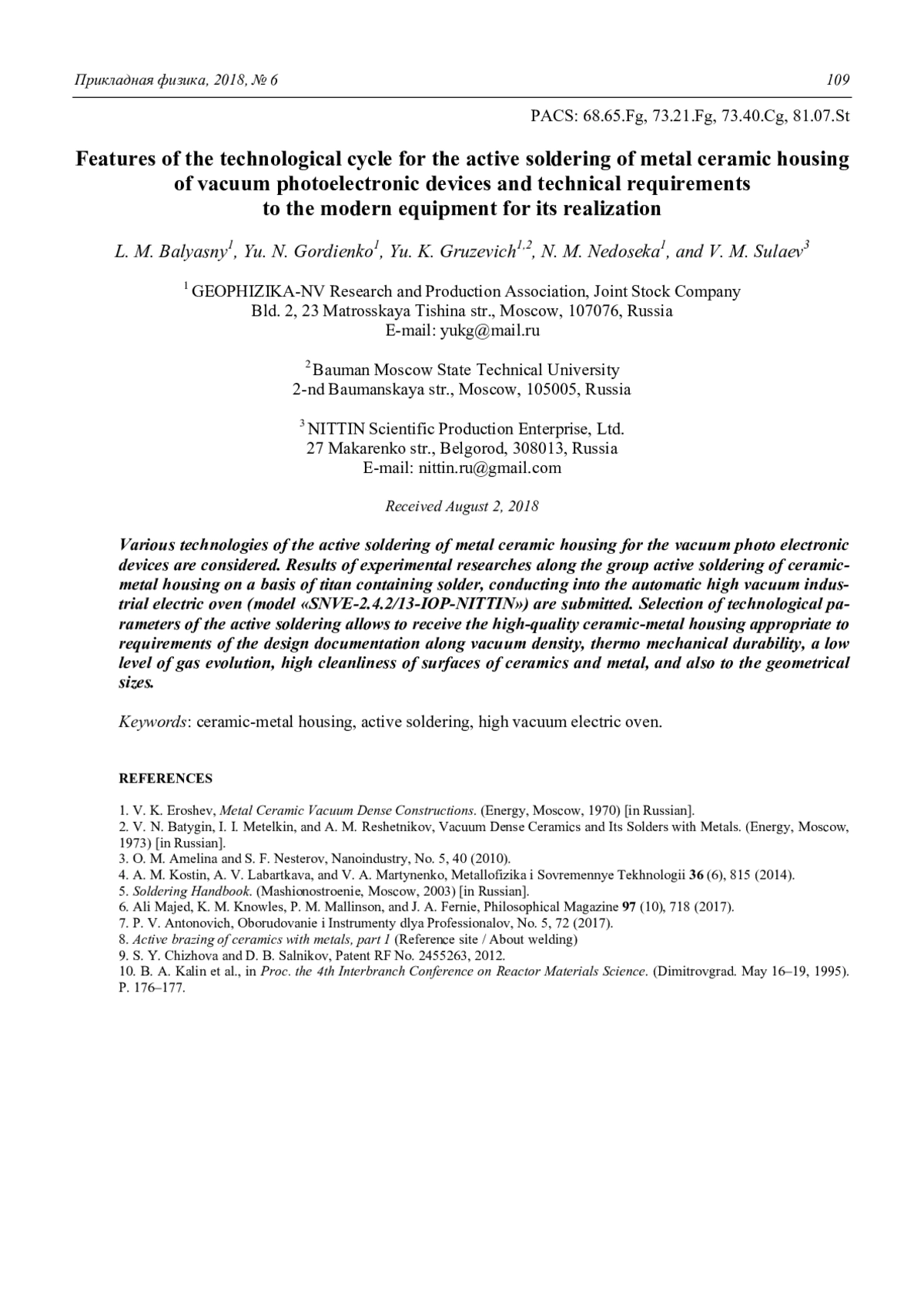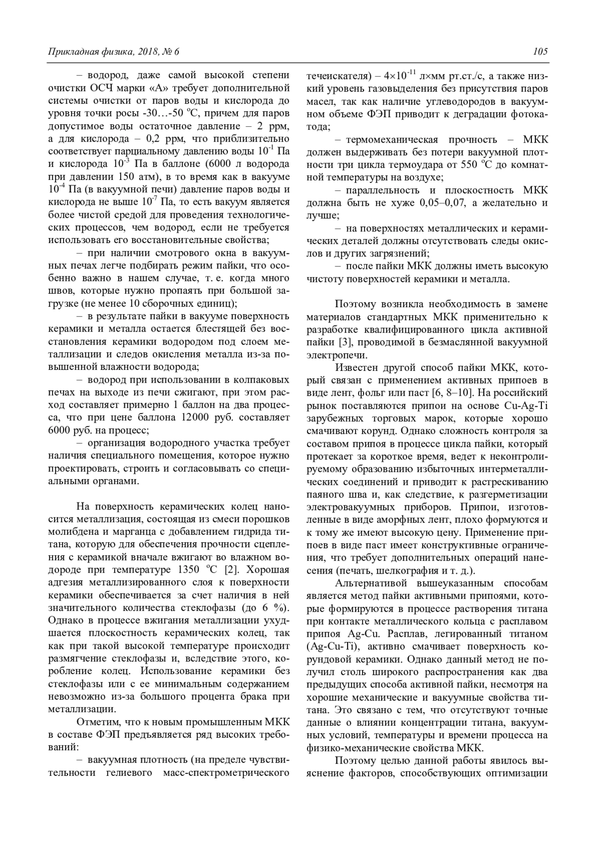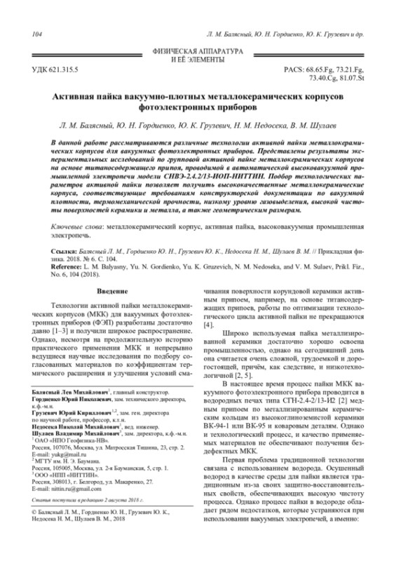 БАЛЯСНЫЙ Л. М., ГОРДИЕНКО Ю. Н., ГРУЗЕВИЧ Ю. К., НЕДОСЕКА Н. М., ШУЛАЕВ В. М. АКТИВНАЯ ПАЙКА ВАКУУМНО-ПЛОТНЫХ МЕТАЛЛОКЕРАМИЧЕСКИХ КОРПУСОВ ФОТОЭЛЕКТРОННЫХ ПРИБОРОВ // ПРИКЛАДНАЯ ФИЗИКА. 2018. №6
