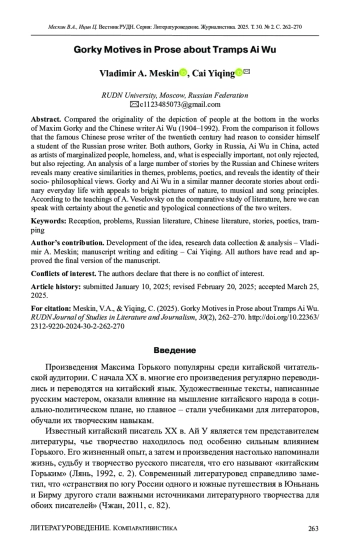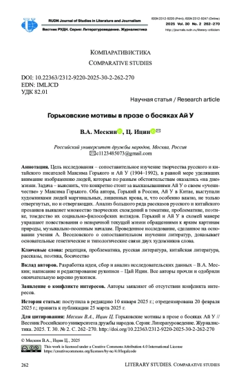 Цель исследования - сопоставительное изучение творчества русского и китайского писателей Максима Горького и Ай У (1904-1992), в равной мере уделявших внимание изображению людей, которые по разным обстоятельствам оказались «на дне» жизни. Задача - выяснить, что конкретно стоит за высказываниями Ай У о своем «ученичестве» у Максима Горького. Оба автора, Горький в России, Ай У в Китае, выступали художниками людей маргинальных, лишенных крова, и, что особенно важно, не только отвергнутых, но и отвергающих. Анализ большого ряда рассказов русского и китайского прозаиков выявляет множество творческих схождений в тематике, проблематике, поэтике, тождество их социально-философских взглядов. Горький и Ай У в схожей манере украшают повествования о невзрачной текущей жизни обращениями к ярким картинам природы, музыкально-песенным началам. Проведенное исследование, сделанное на основании учения А. Веселовского о сопоставительном изучении литератур, доказывает основательные генетические и типологические связи двух художников слова.