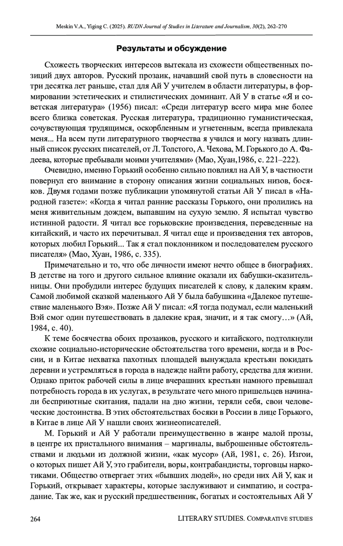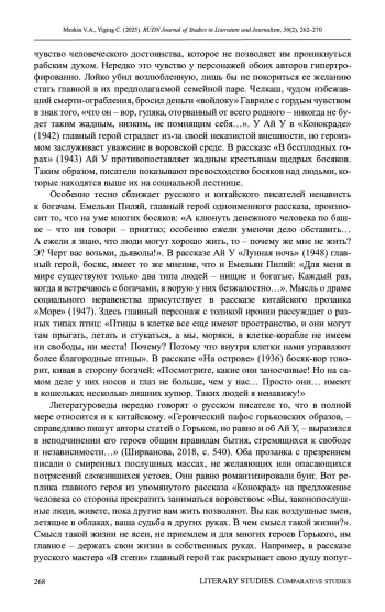 9. Чжан Цзяньфэн. Сравнение по размышлению национальных характеров Ай У и Горького. [张建锋. 艾芜与高尔基反思国民性的比较] // Журнал Университета Чэнду, 2011. № 1. С. 82-87.