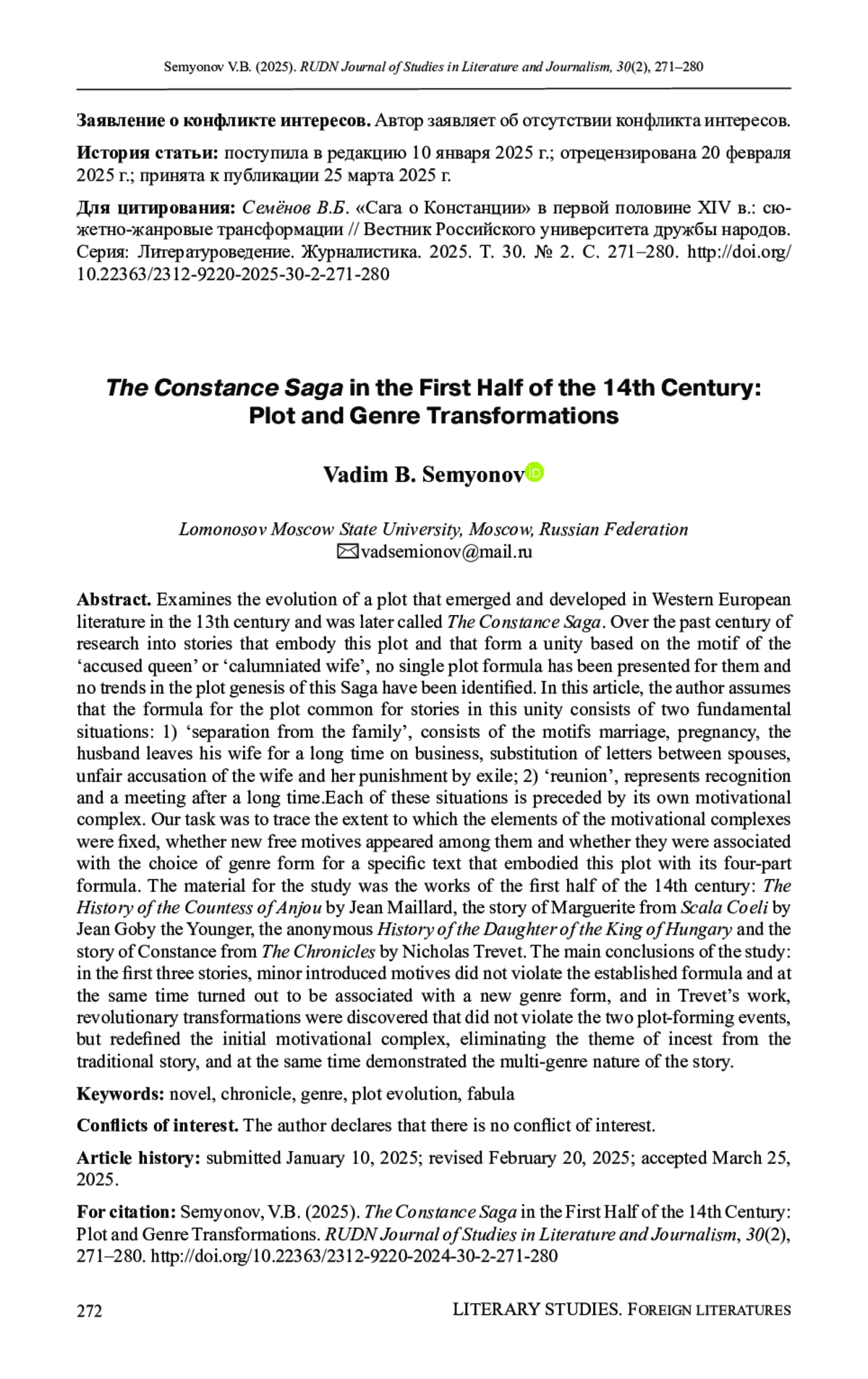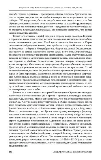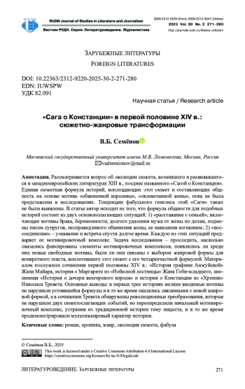 Рассматривается вопрос об эволюции сюжета, возникшего и развивавшегося в западноевропейских литературах XIII в., позднее названного «Сагой о Констанции». Единая сюжетная формула историй, воплощающих этот сюжет и составляющих общность на основе мотива «обвиненной королевы», «оклеветанной жены», пока не была представлена в исследованиях. Тенденции фабульного генезиса этой «Саги» также не были выявлены. В статье автор исходит из того, что формула общности для подобных историй состоит из двух основополагающих ситуаций: 1) «расставание с семьей», включающее мотивы брака, беременности, долгого удаления мужа от жены по делам, подмены писем супругов, несправедливого обвинения жены, ее наказания изгнанием; 2) «воссоединение» - узнавание и встреча спустя долгое время. Каждую из этих ситуаций предваряет ее мотивировочный комплекс. Задача исследования - проследить, насколько оказались фиксированы элементы мотивировочных комплексов, появлялись ли среди них новые свободные мотивы, были ли они связаны с выбором жанровой формы для конкретного текста, воплотившего этот сюжет с его четырехчастной формулой. Материалом послужили сочинения первой половины XIV в.: «История графини Анжуйской» Жана Майара, история о Маргарите из «Небесной лестницы» Жана Гоби-младшего, анонимная «История о дочери венгерского короля» и история о Констанции из «Хроник» Николаса Тревета. Основные выводы: в первых трех историях мелкие вводимые мотивы не нарушили устоявшейся формулы и в то же время оказались связанными с новой жанровой формой, а в сочинении Тревета обнаружены революционные преобразования, которые не нарушили двух сюжетослагающих событий, но переопределили начальный мотивировочный комплекс, устранив из традиционной истории тему инцеста, и в то же время продемонстрировали мультижанровый характер истории.