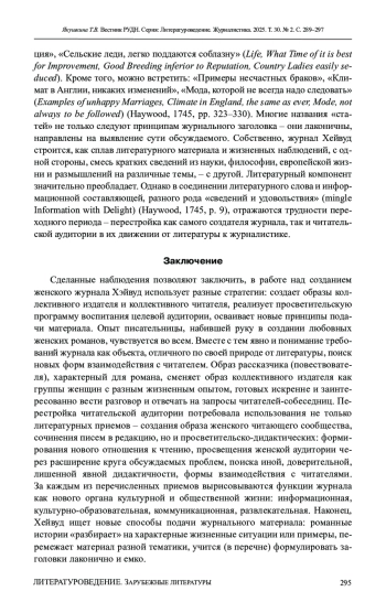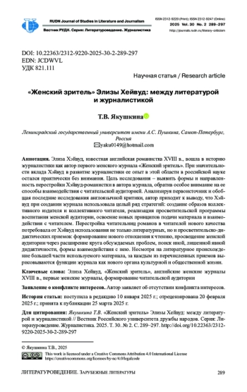 Цель исследования - выявить формы и направленность перестройки Хэйвуд-романистки в автора журнала, обратив особое внимание на ее способы взаимодействия с читательской аудиторией. Анализируя первоисточник и обобщая последние исследования англоязычной критики, автор приходит к выводу, что Хэйвуд при создании журнала использовала целый ряд стратегий: создание образов коллективного издателя и коллективного читателя, реализация просветительской программы воспитания женской аудитории, освоение новых принципов подачи материала и взаимодействия с читателем. Перестройка читательниц романов в читателей нового качества потребовала от Хэйвуд использования не только литературных, но и просветительско-дидактических приемов: формирование нового отношения к чтению, просвещение женской аудитории через расширение круга обсуждаемых проблем, поиск иной, лишенной явной дидактичности, формы взаимодействия с нею. Несмотря на литературное происхождение большей части используемого материала, за каждым из перечисленных приемов вырисовываются функции журнала как нового органа культурной и общественной жизни.