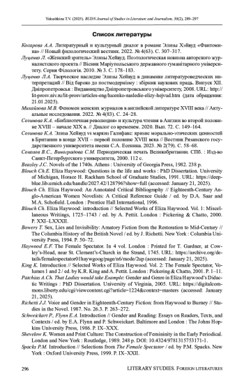 10. Blouch Ch. Eliza Haywood: An Annotated Critical Bibliography // Eighteenth-Century Anglo-American Women Novelists: A Critical Reference Guide / ed. by D.A. Saar and M.A. Schofield. London: Prentice Hall International, 1996.