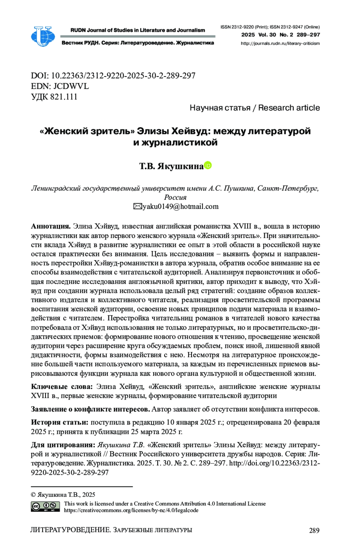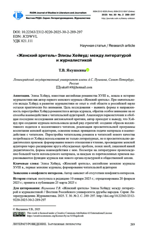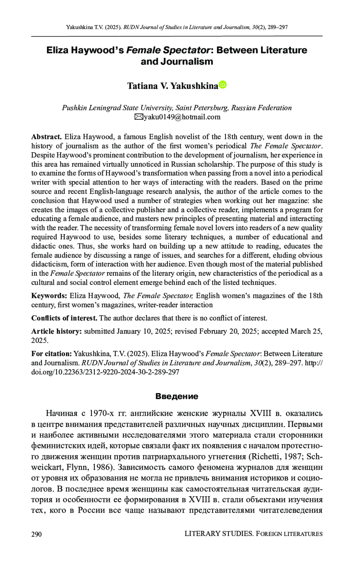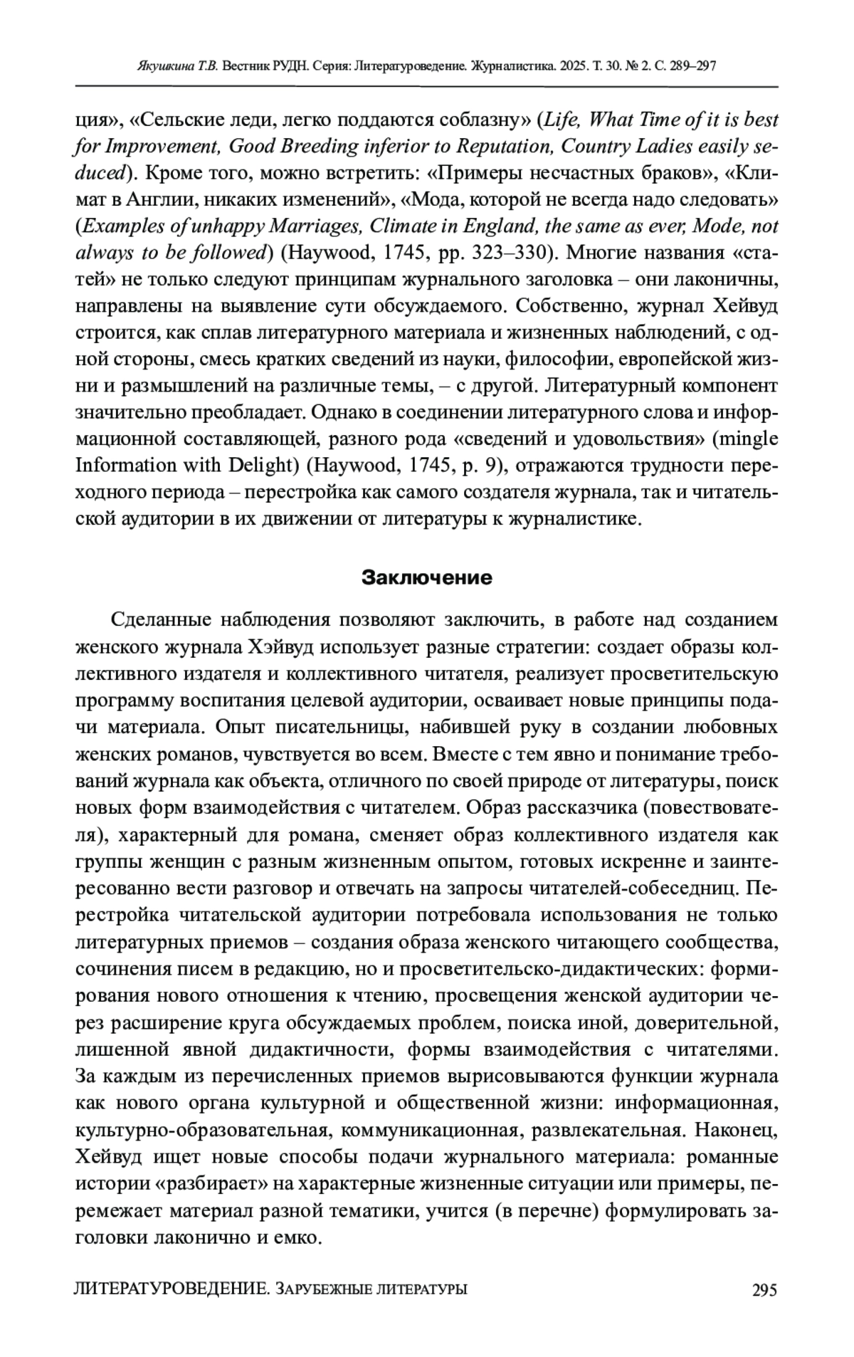 13. Haywood E.F. The Female Spectator. In 4 vol. London: Printed for T. Gardner, at Cowley’s-Head, near St. Clement’s-Church in the Strand, 1745. URL: https://archive.org/details/femalespectator01haywgoog/page/n6/mode/2up (accessed: January 21, 2025).
