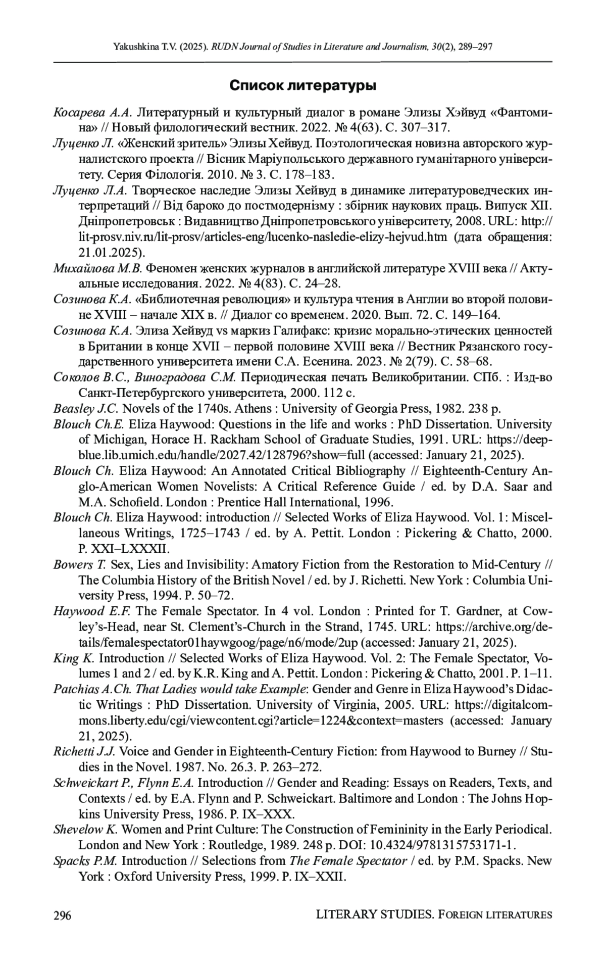 9. Blouch Ch.E. Eliza Haywood: Questions in the life and works: PhD Dissertation. University of Michigan, Horace H. Rackham School of Graduate Studies, 1991. URL: https://deepblue.lib.umich.edu/handle/2027.42/128796?show=full (accessed: January 21, 2025).