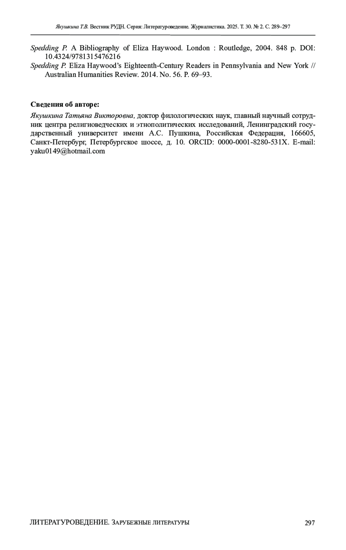20. Spedding P. A Bibliography of Eliza Haywood. London: Routledge, 2004. 848 p. DOI: 10.4324/9781315476216