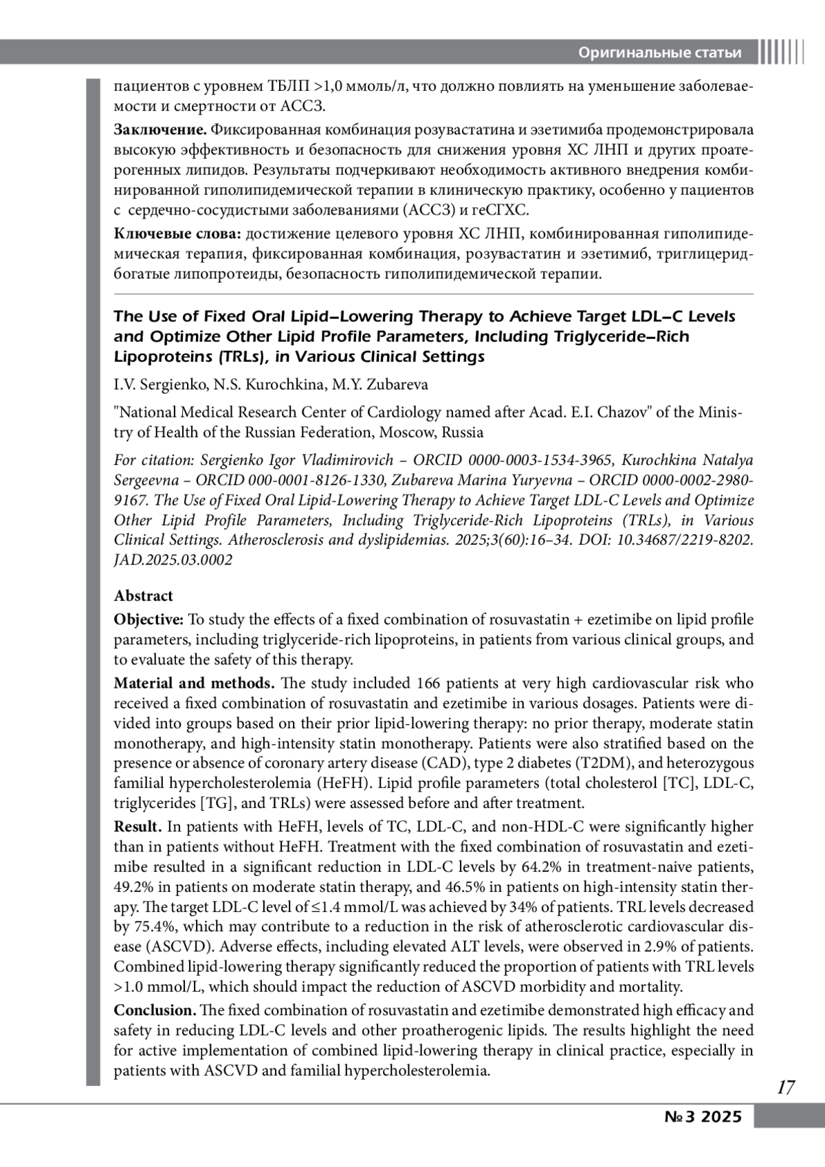Заключение. Фиксированная комбинация розувастатина и эзетимиба продемонстрировала высокую эффективность и безопасность для снижения уровня ХС ЛНП и других проатерогенных липидов. Результаты подчеркивают необходимость активного внедрения комбинированной гиполипидемической терапии в клиническую практику, особенно у пациентов с сердечно-сосудистыми заболеваниями (АССЗ) и геСГХС.