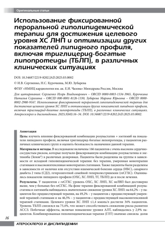 Цель: изучить влияние фиксированной комбинации розувастатин + эзетимиб на показатели липидного профиля, включая триглицерид-богатые липопротеиды, у пациентов различных клинических групп и оценить безопасность назначения данной терапии.