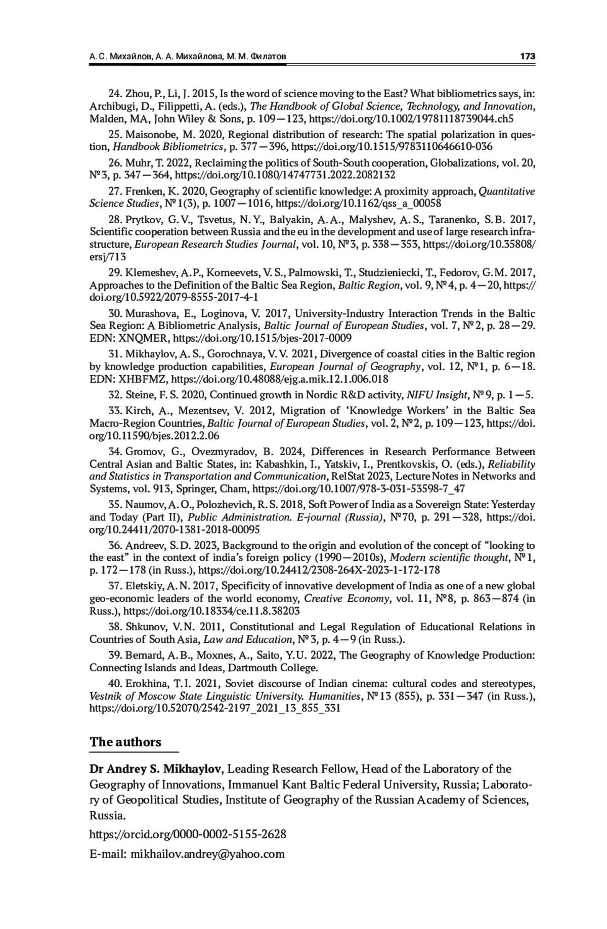 31.Mikhaylov, A. S., Gorochnaya, V. V. 2021, Divergence of coastal cities in the Baltic region by knowledge production capabilities, European Journal of Geography, vol. 12, № 1, p. 6—18. EDN: XHBFMZ, https://doi.org/10.48088/ejg.a.mik.12.1.006.018