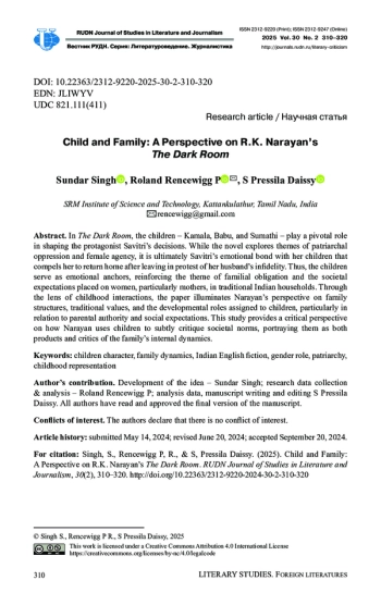 In The Dark Room, the children - Kamala, Babu, and Sumathi - play a pivotal role in shaping the protagonist Savitri’s decisions. While the novel explores themes of patriarchal oppression and female agency, it is ultimately Savitri’s emotional bond with her children that compels her to return home after leaving in protest of her husband’s infidelity. Thus, the children serve as emotional anchors, reinforcing the theme of familial obligation and the societal expectations placed on women, particularly mothers, in traditional Indian households. Through the lens of childhood interactions, the paper illuminates Narayan’s perspective on family structures, traditional values, and the developmental roles assigned to children, particularly in relation to parental authority and social expectations. This study provides a critical perspective on how Narayan uses children to subtly critique societal norms, portraying them as both products and critics of the family’s internal dynamics.