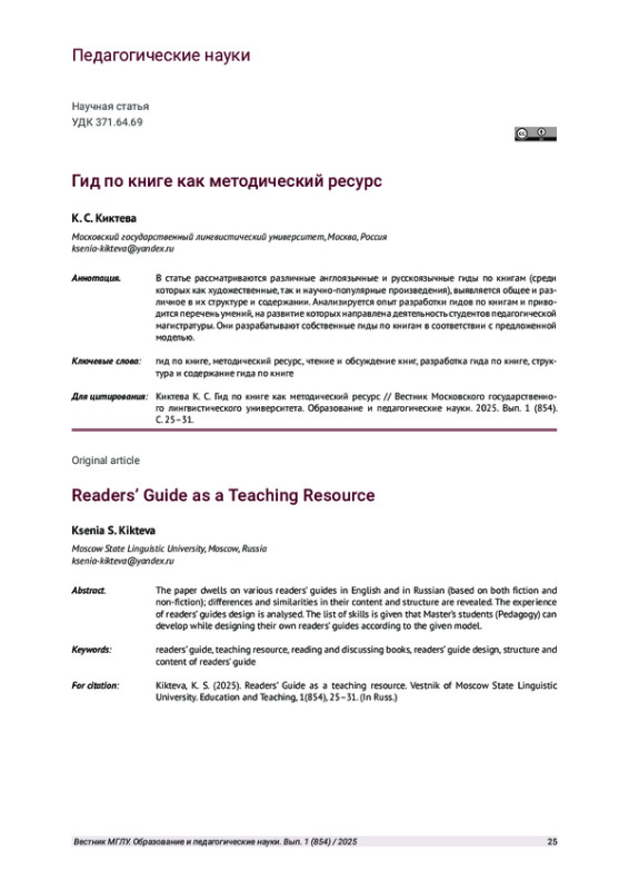 11. Киктева К. С., Романичева Е. С. Гайды по книгам // Читатель в школе: сборник статей / под ред. Е. А. Асоновой, Е. С. Романичевой. М.: Библиомир, 2020. С. 113-130. EDN: NDHPFE