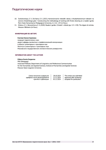 7. Коряковцева Н. Ф. Чтение на иностранном языке как образовательная цель в контексте межкультурного общения // Вестник МГЛУ Образование и педагогические науки. 2023. Вып. 1(846). С. 20-25. EDN: BXGISK