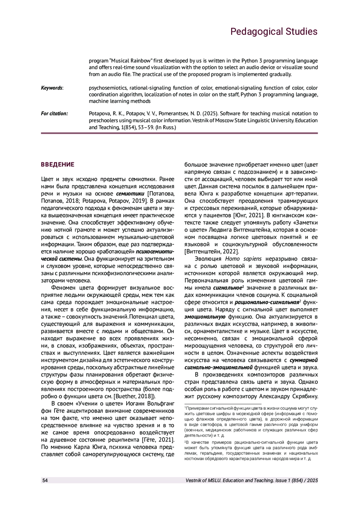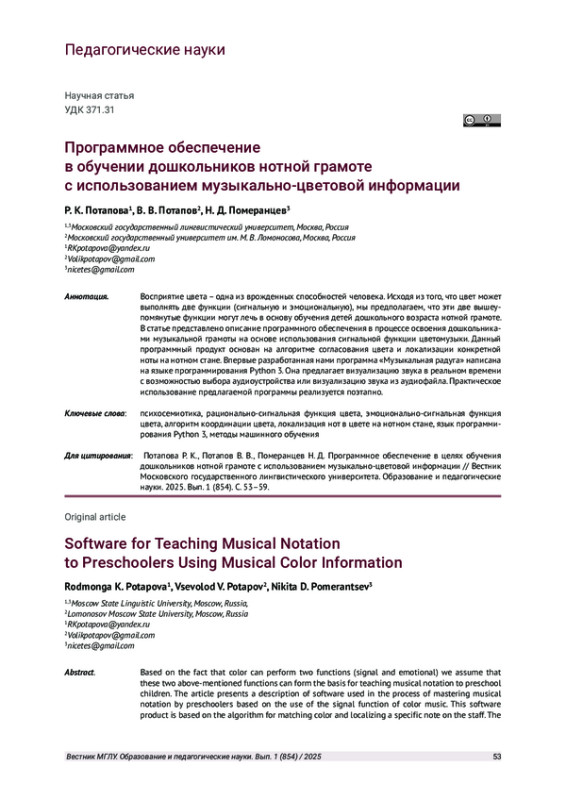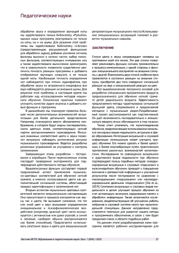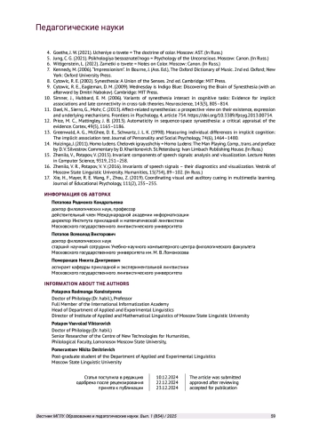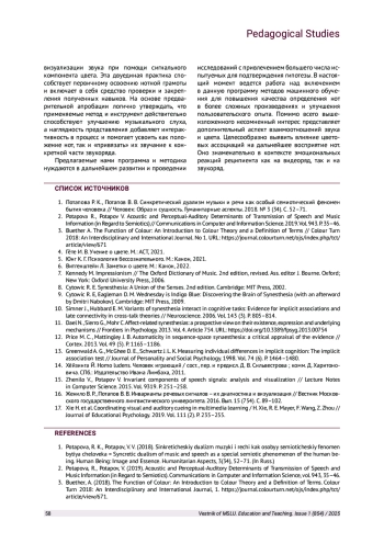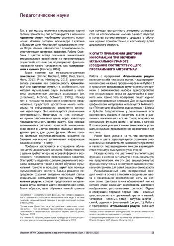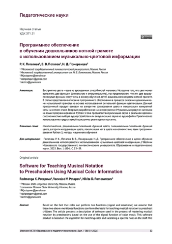 Цвет и звук исходно предметы семиотики. Ранее нами была представлена концепция исследования речи и музыки на основе семиотики [Потапова, Пота пов, 2018; Potapova, Potapov, 2019]. В рамках педагогического подхода к феноменам цвета и звука вышеозначенная концепция имеет практическое значение. Она способствует эффективному обучению нотной грамоте и может успешно актуализироваться с использованием музыкально-цветовой информации. Таким образом, еще раз подтверждается наличие хорошо «работающей» психосемиотической системы. Она функционирует на зрительном и слуховом уровне, которые непосредственно связаны с различными психофизиологическими анализаторами человека.