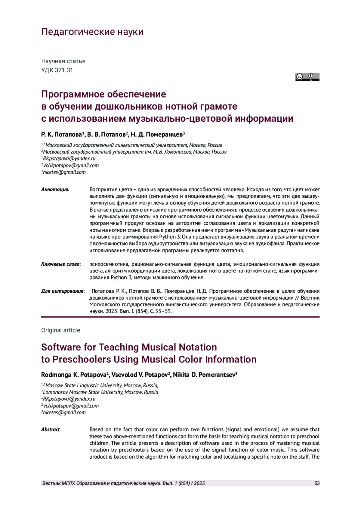 2. Potapova R., Potapov V. Acoustic and Perceptual-Auditory Determinants of Transmission of Speech and Music Information (in Regard to Semiotics) // Communications in Computer and Information Science. 2019. Vol. 943. P. 35-46. EDN: RJUHDE