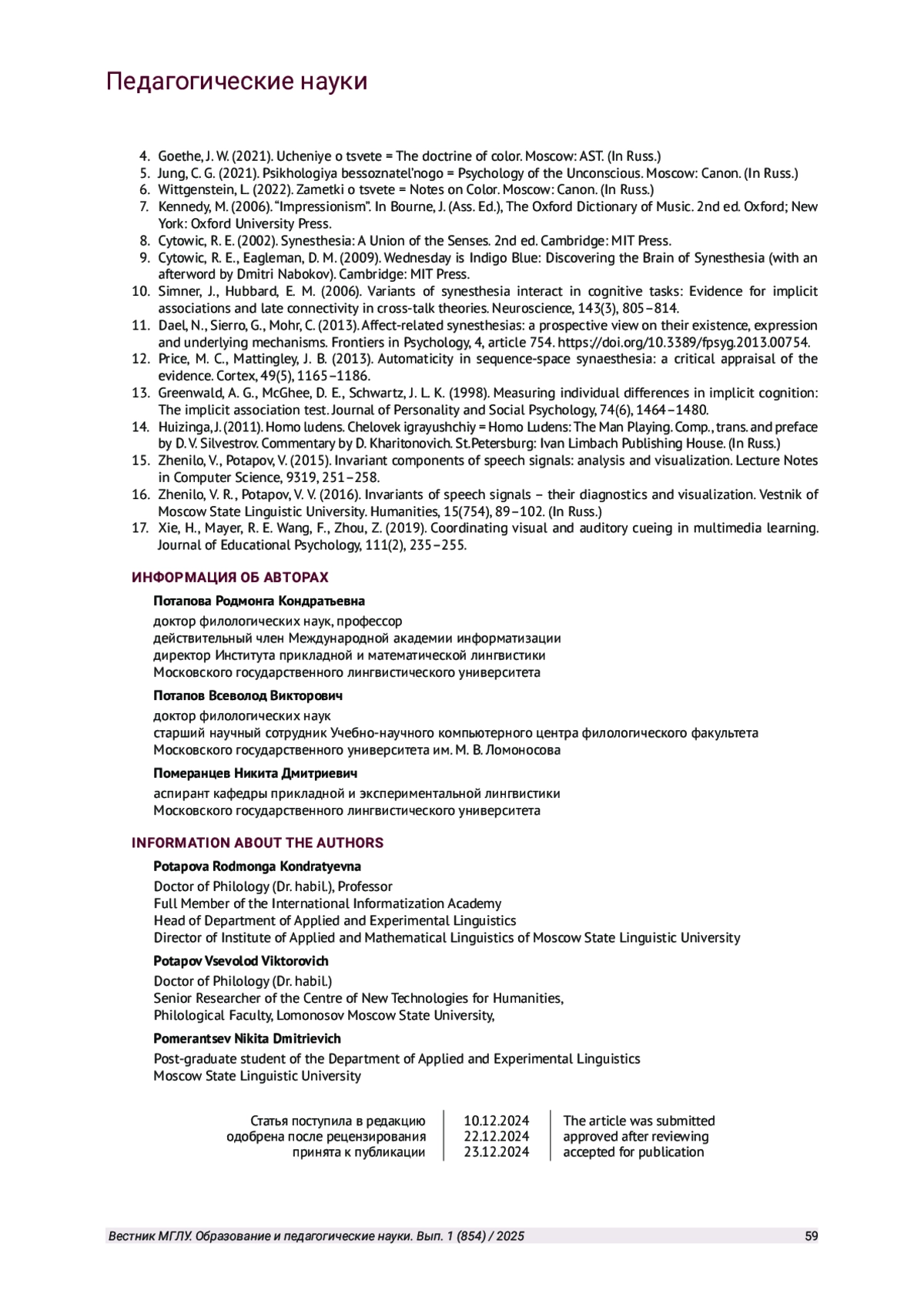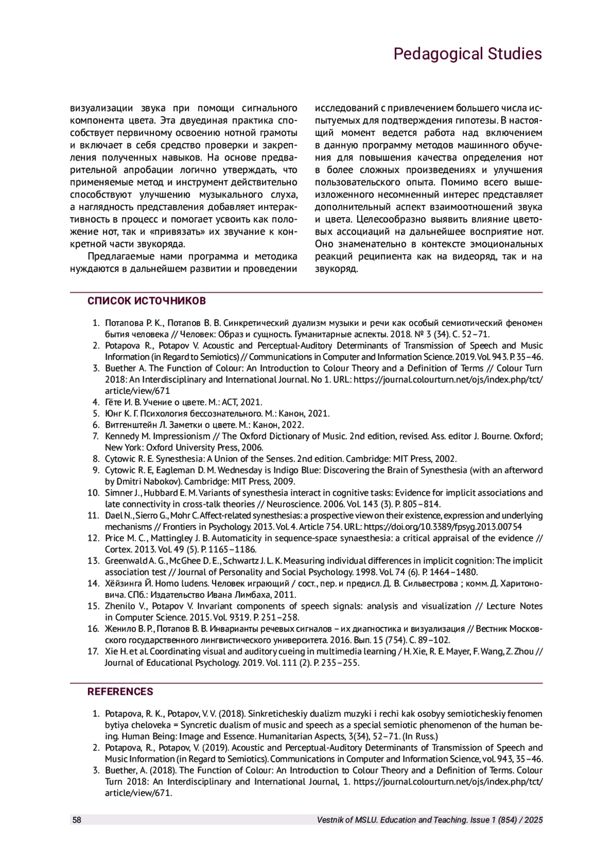1. Потапова Р. К., Потапов В. В. Синкретический дуализм музыки и речи как особый семиотический феномен бытия человека // Человек: Образ и сущность. Гуманитарные аспекты. 2018. № 3 (34). С. 52-71. EDN: YLSHKP