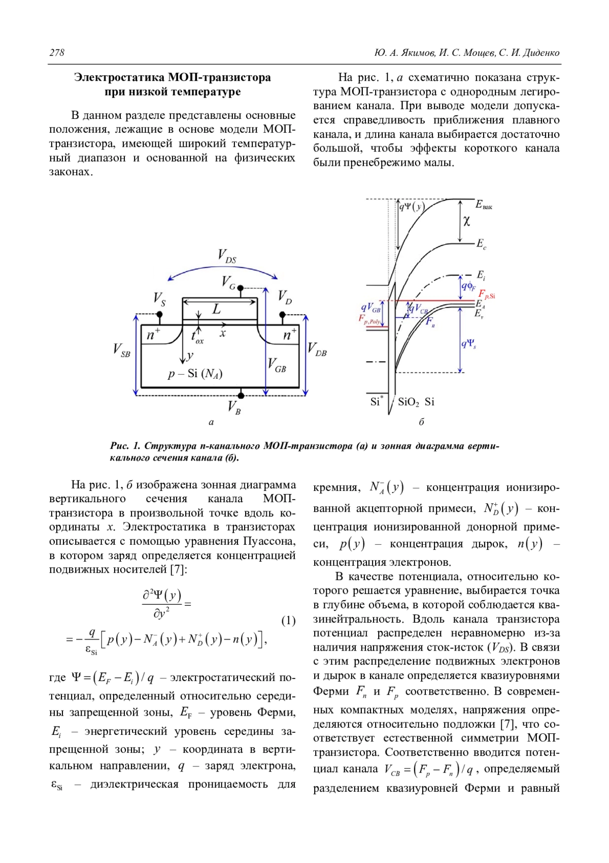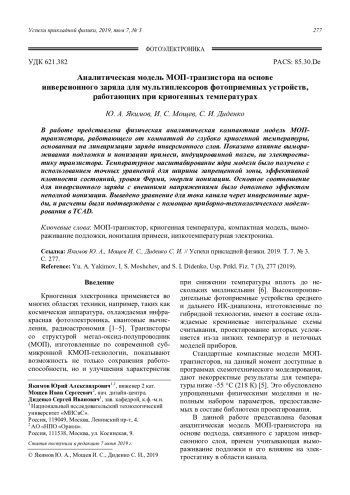 В работе представлена физическая аналитическая компактная модель МОП-транзистора, работающего от комнатной до глубоко криогенной температуры, основанная на линеаризации заряда инверсионного слоя. Показано влияние вымораживания подложки и ионизации примеси, индуцированной полем, на электростатику транзистора. Температурное масштабирование ядра модели было получено с использованием точных уравнений для ширины запрещенной зоны, эффективной плотности состояний, уровня Ферми, энергии ионизации. Основное соотношение для инверсионного заряда с внешними напряжениями было дополнено эффектом неполной ионизации. Выведено уравнение для тока канала через инверсионные заряды, и расчеты были подтверждены с помощью приборно-технологического модели-рования в TCAD.