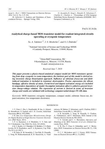 6. Incandela R., Song L., Homulle H., Charbon E., Vladimirescu A., Sebastiano F. // IEEE Journal of the Electron Devices Society. 2018. Vol. 6. P. 996.
